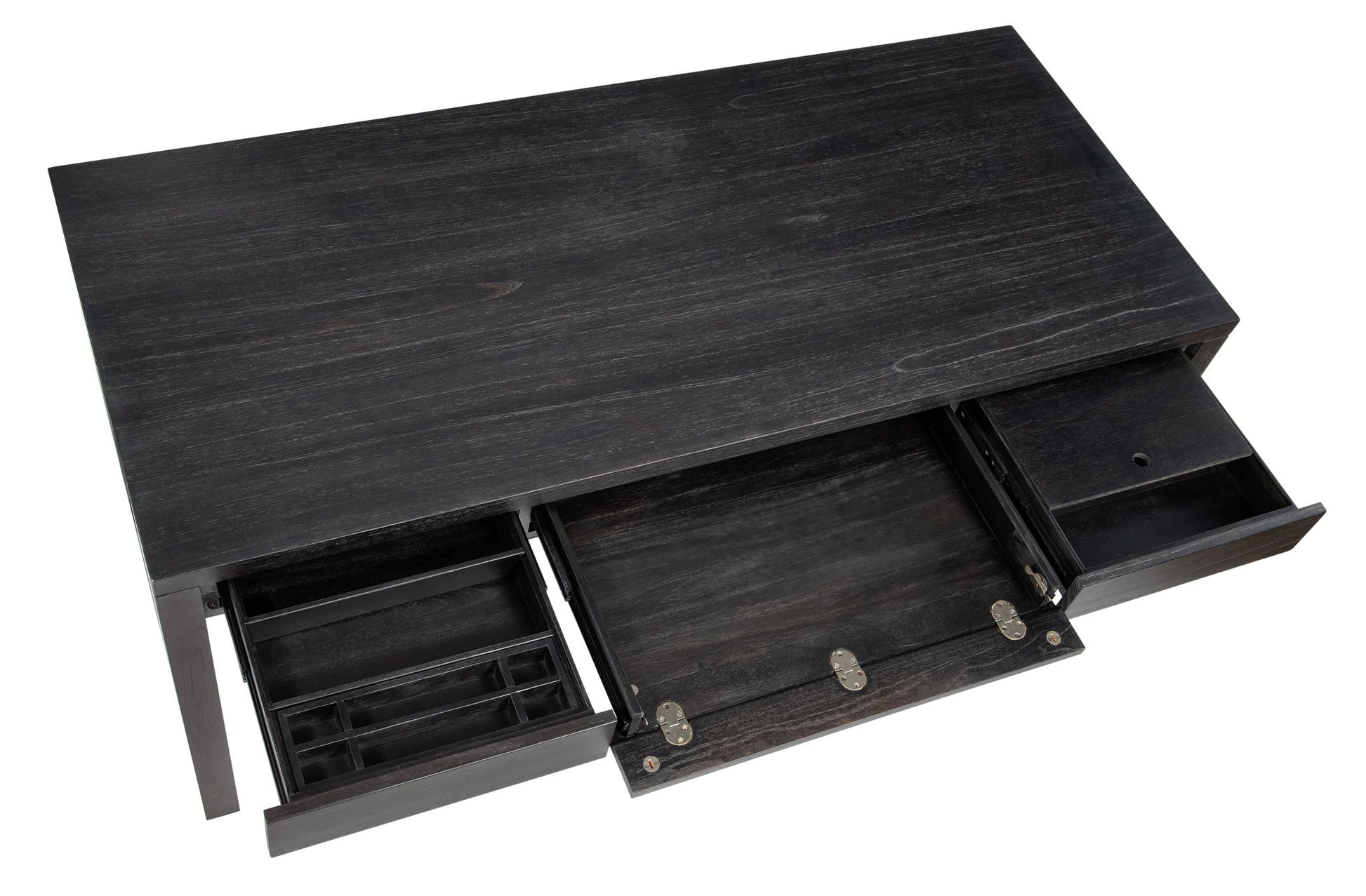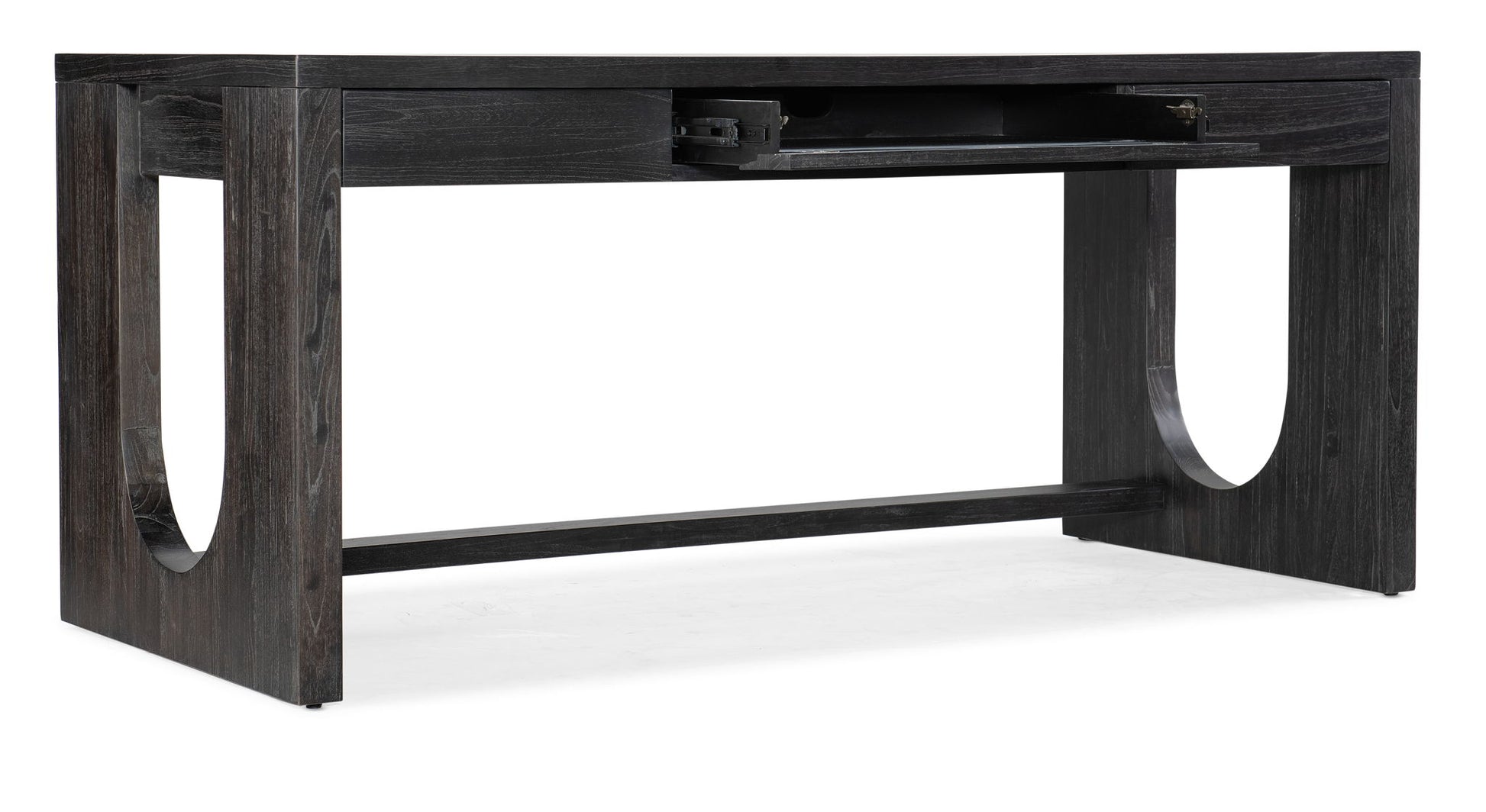 Set a youthful, energetic tone in your work space with the Commerce & Market Writing Desk, crafted of Mindi Veneers with a black finish with the wood grain showing through. The organic silhouette features 3 drawers, two removable partitions with both the left and right-side drawers and a pencil tray and mouse pad that can be used in either the left or right-side drawer. The drop-front center drawer has a cut-out for wire management.
