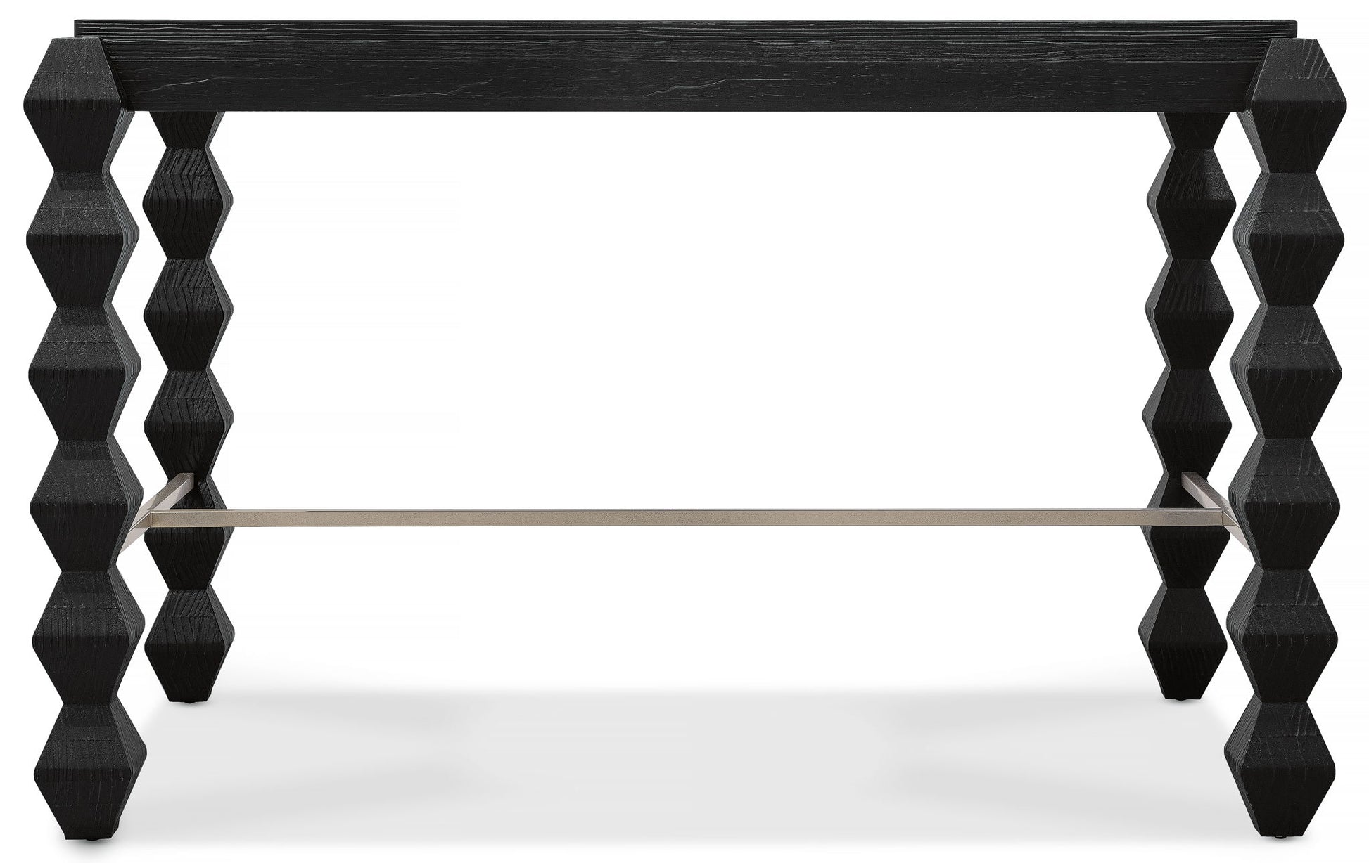 A unique piece in the collection, the Xaden Gathering Desk is distinguished by its Charred Black finish, achieved using the ancient Japanese technique of Shou Sugi Ban, which mimics the look of burnt wood. The desk features sculpted legs and a metal crossbar stretcher in pewter finish for additional support and style. With distressing details such as sandblasting, wormholes, and rock distressing, this desk offers a rugged, modern look perfect for creative spaces.
