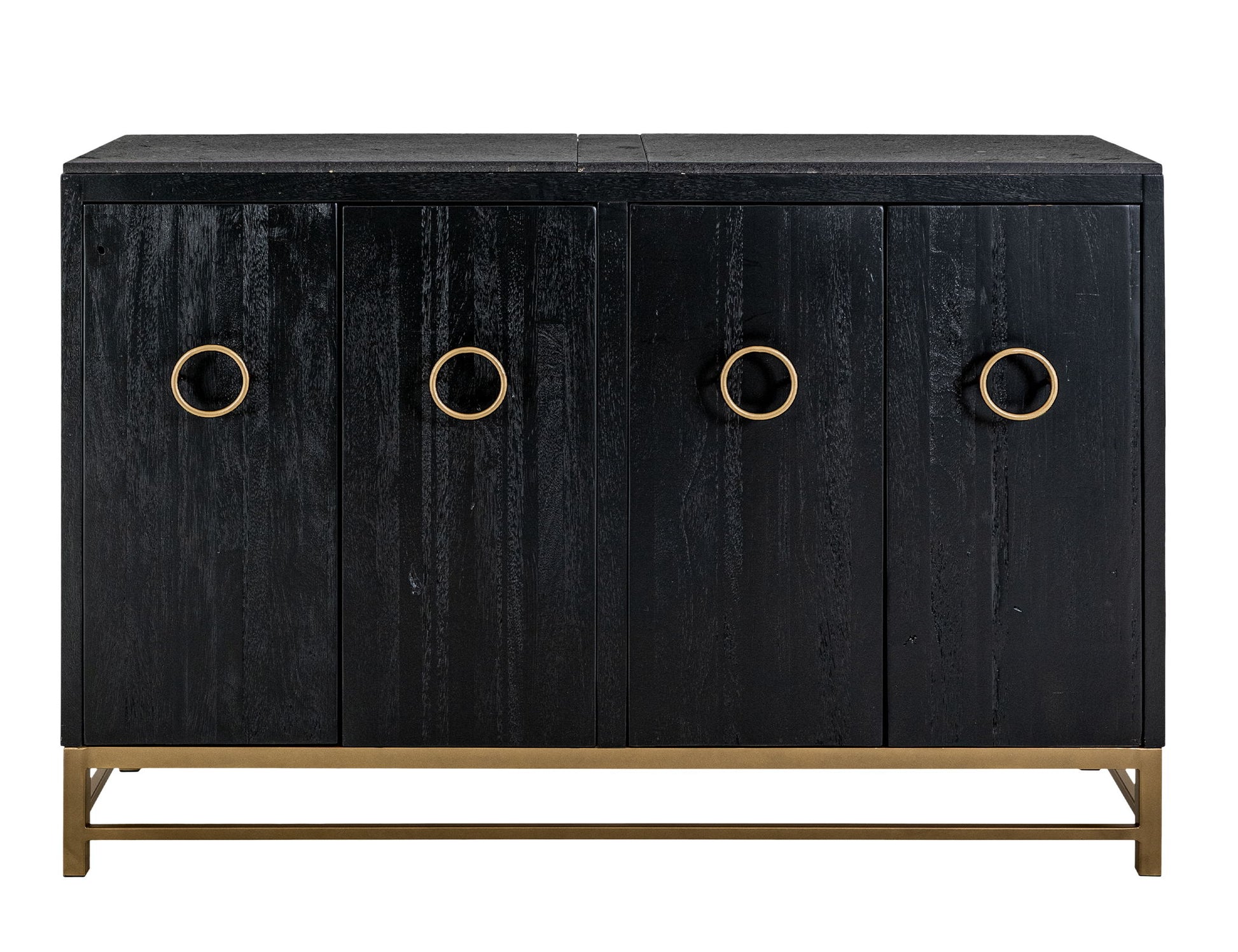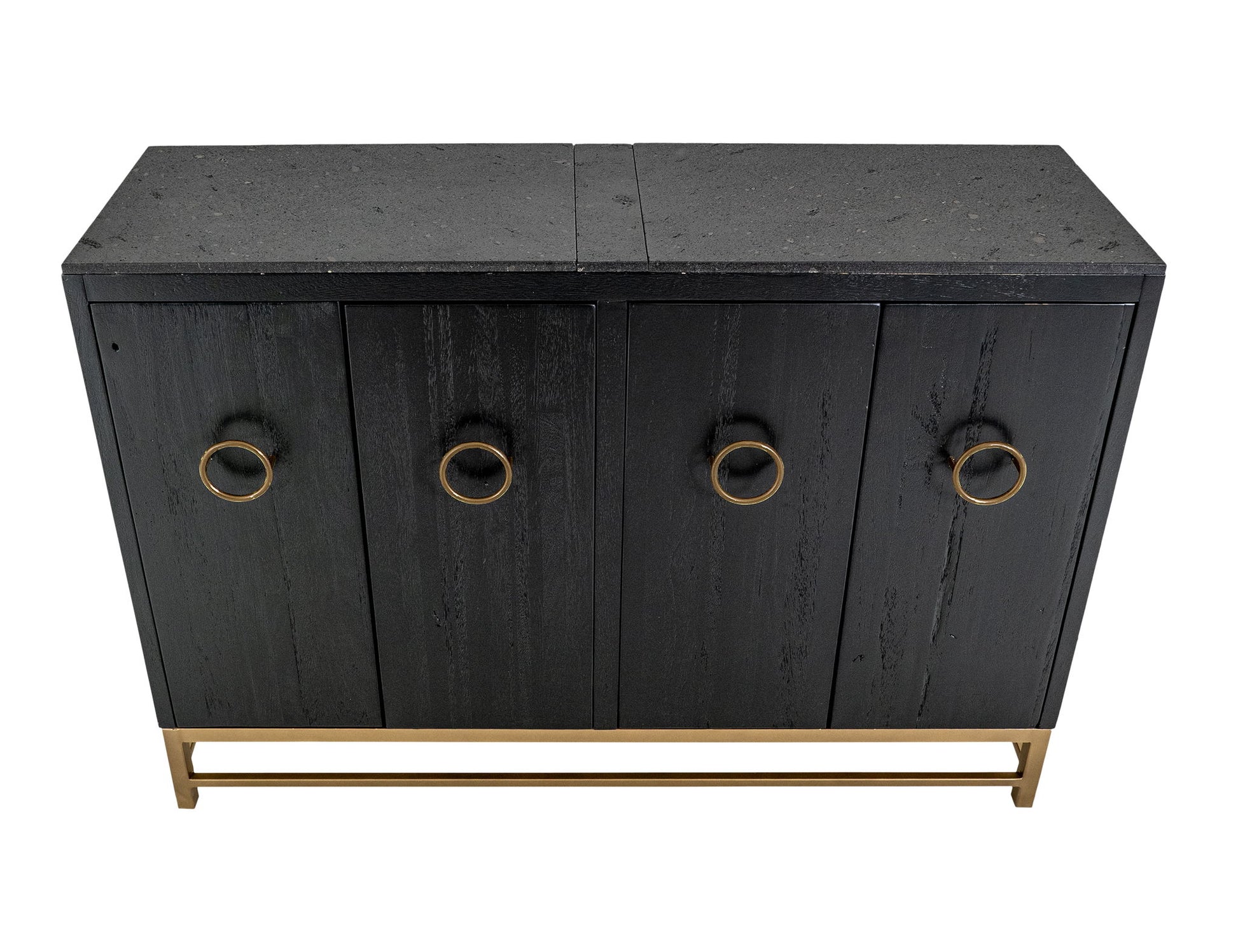 4 Door, Console. The Ebano Console, features a breathtaking top made from natural stone, ethically sourced from a quarry. This stunning piece brings an air of elegant sophistication to any room. Its metal base provides reliable support and creates a striking contrast with the stone's organic texture. The custom metal pulls adorn the doors in a luxurious golden finish, enhancing the captivating black-and-gold contrast. The sleek black finish of the Ebano Console reflects a modern deco design and makes it a truly eye-catching addition to your decor. Using multiple species of wood in its construction showcases different grains, adding uniqueness. Transform your living area with this inspiring black furniture console that seamlessly combines functionality with aesthetic appeal.