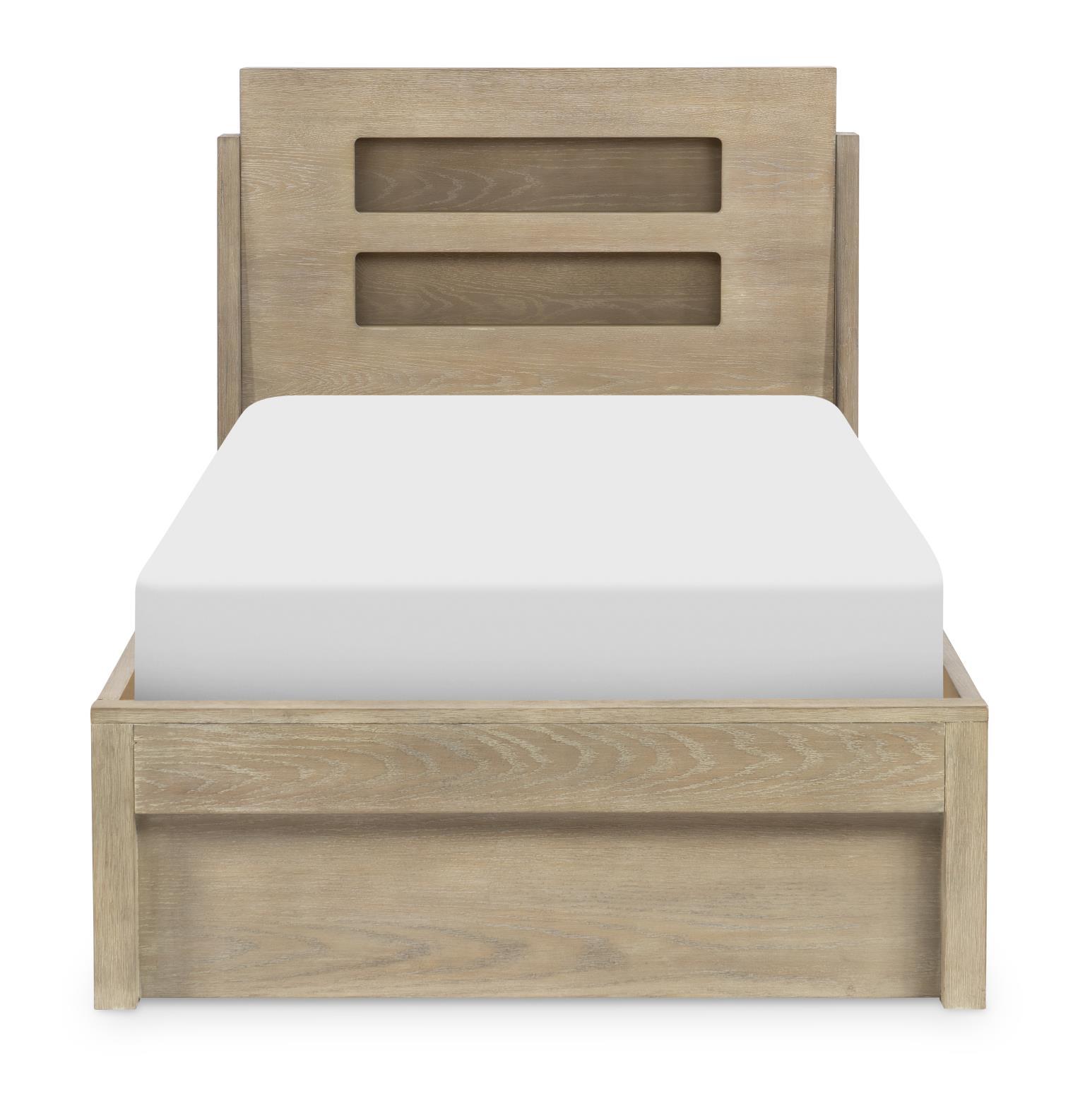 Clean contemporary forms and multi-functional pieces create the energetic District collection by Legacy Kids - Teens. The collection is crafted of Straight Grain,, White Oak with a Weathered Oak finish and accented by rustic pewter hardware. A focal-point piece is the Captain's Bed,, combining the functions of sleep,, study,, and storage in a compact footprint. Below the elevated bed are 4 drawers and a trundle,, along with 2 pull-out work surfaces. All sizes of the panel beds have inset headboards and footboards with lighting operated by remote control or an app that can be downloaded,, allowing children and teens to control lighting colors,, patterns,, and intensity,, and even to program lighting to correspond to the rhythms of the music.