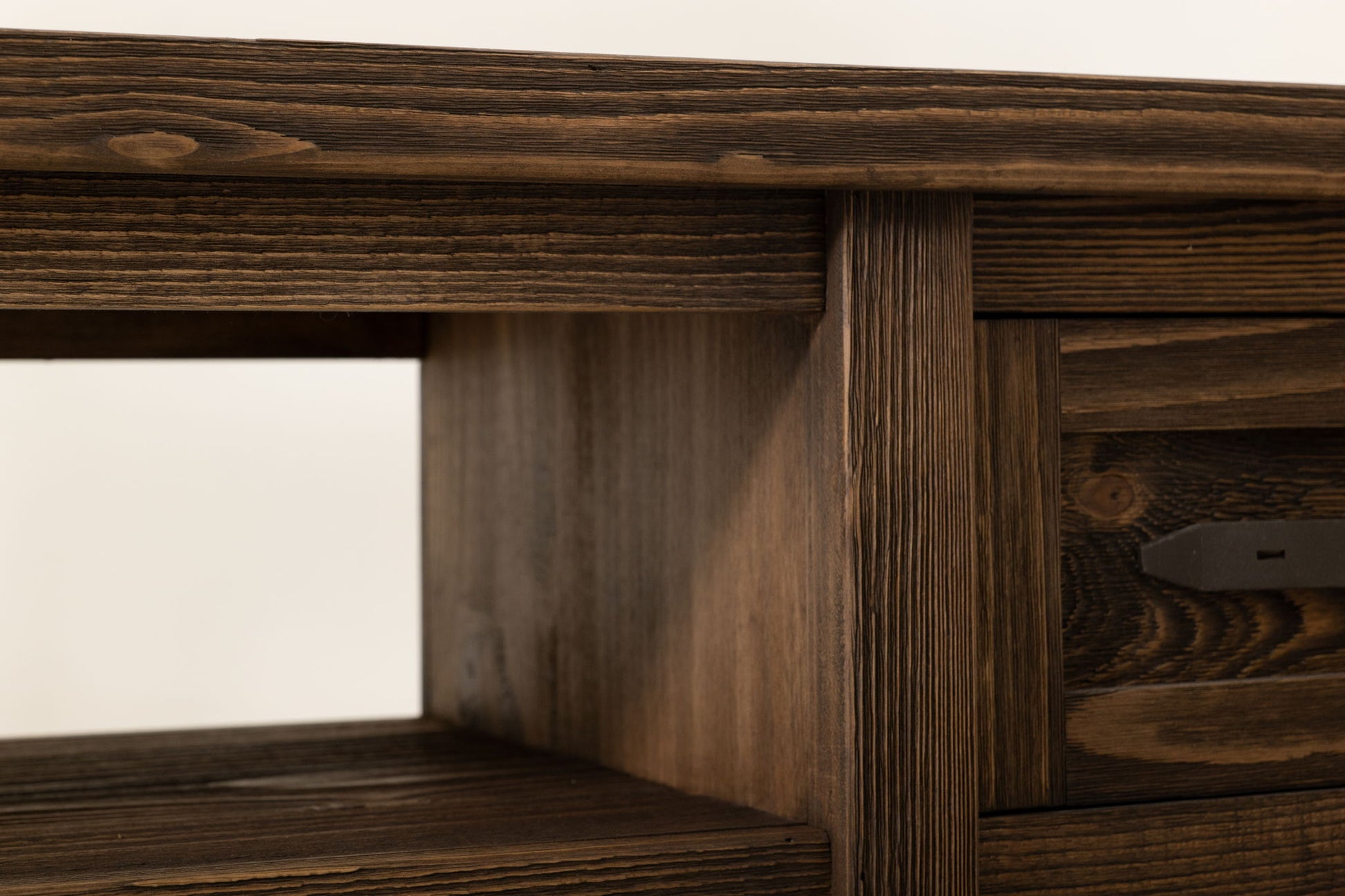 - Lightly distressed wood with a brown multi-step lacquer finish.