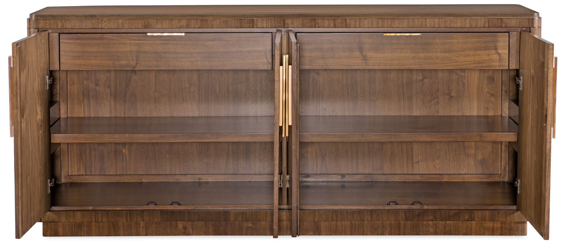 The Eleana Buffet is a statement piece with its Light Caramel walnut veneer finish and Sunlit Bronze hardware. Featuring four soft-close doors, adjustable interior shelving, and two tray drawers with a removable silverware tray, this buffet is as practical as it is stylish. Its plinth base adds a touch of contemporary sophistication, perfect for transitional dining rooms.