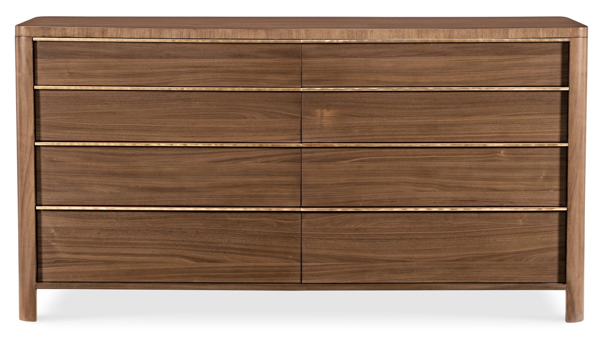 The Eleana Eight Drawer Dresser exudes timeless elegance with its Light Caramel walnut veneers and Sunlit Bronze hardware. It features eight self-closing drawers, a removable jewelry tray, and cedar-lined bottom drawers, offering ample storage with a sophisticated, sculptural silhouette.