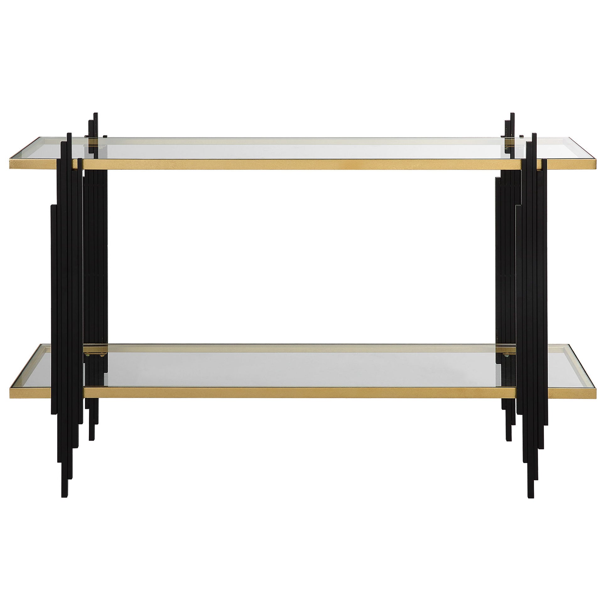 Gold Leaf Shelves Seem To Float Between Matte Black Iron Legs Reminiscent Of A Cityscape. Two Shelves Are Clear Tempered Glass.