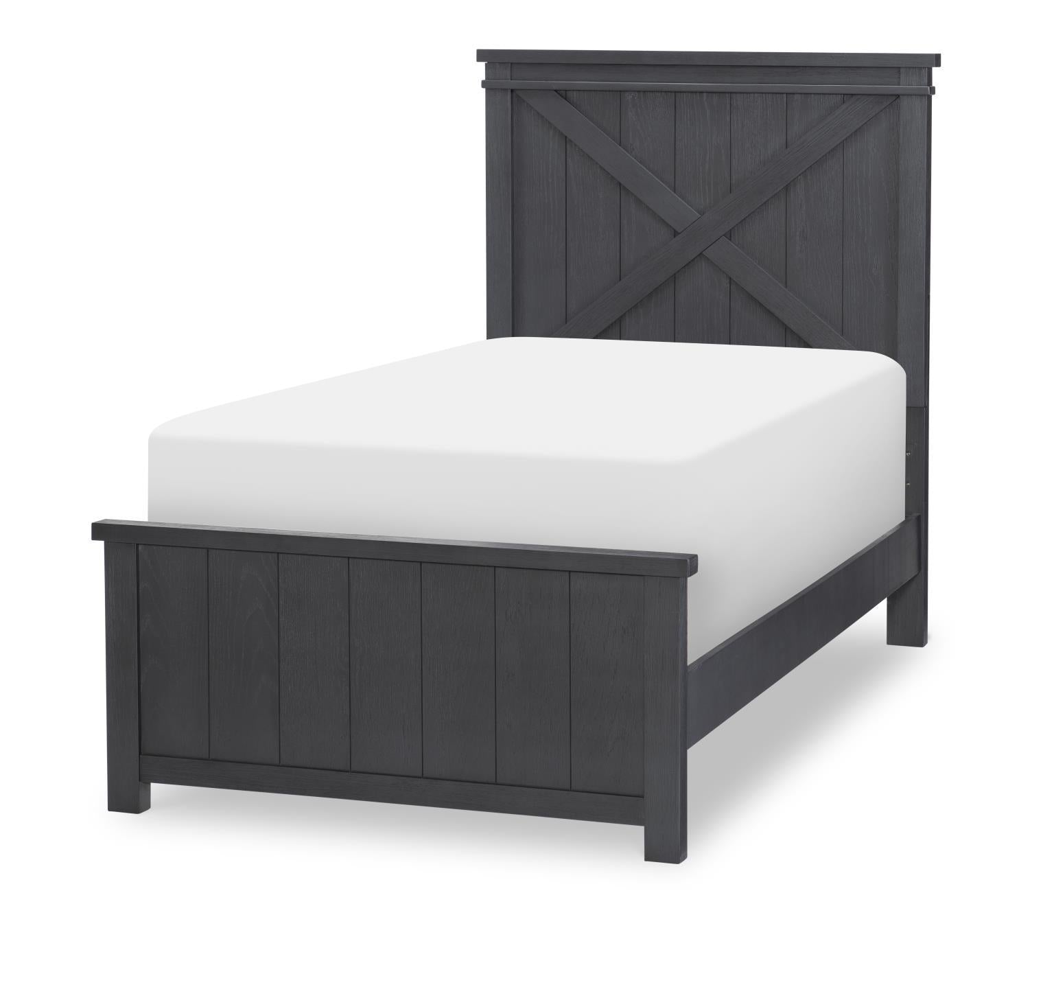 Rustic,, comfortable,, yet modern. Clean lines combine with natural textures and dark tones to create the Flatiron youth collection. Modern farmhouse designs such as block feet,, flat drawer fronts,, and X motifs on side panels offer a lot of details without feeling cluttered. The natural variations of the grain and rich Midnight finish offer a casual,, livable style. Simple Antique Brass finished bar pull and knob hardware completes each piece.