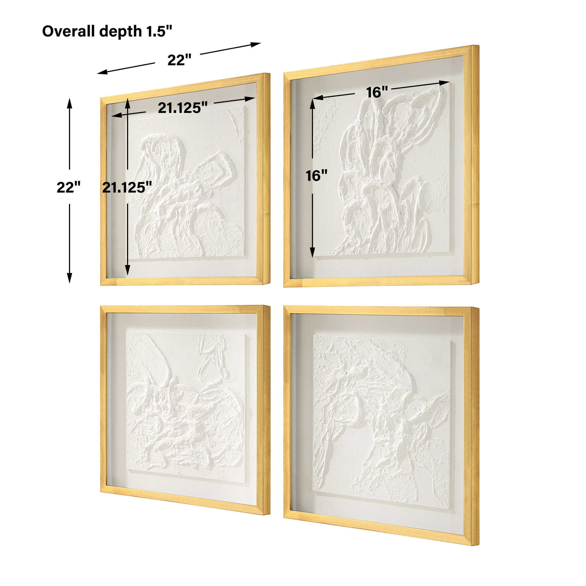 Hand Painted Abstracts, These Elegant Pieces Of Art Exhibit Thick Dimensional Texture And An All-white Color Pallet. A Light Gold Finished Shadow Box Frame Under Glass Surrounds Each Piece. Due To The Handcrafted Nature Of This Artwork, Each Piece May Have Subtle Differences. May Be Hung Horizontal Or Vertical.