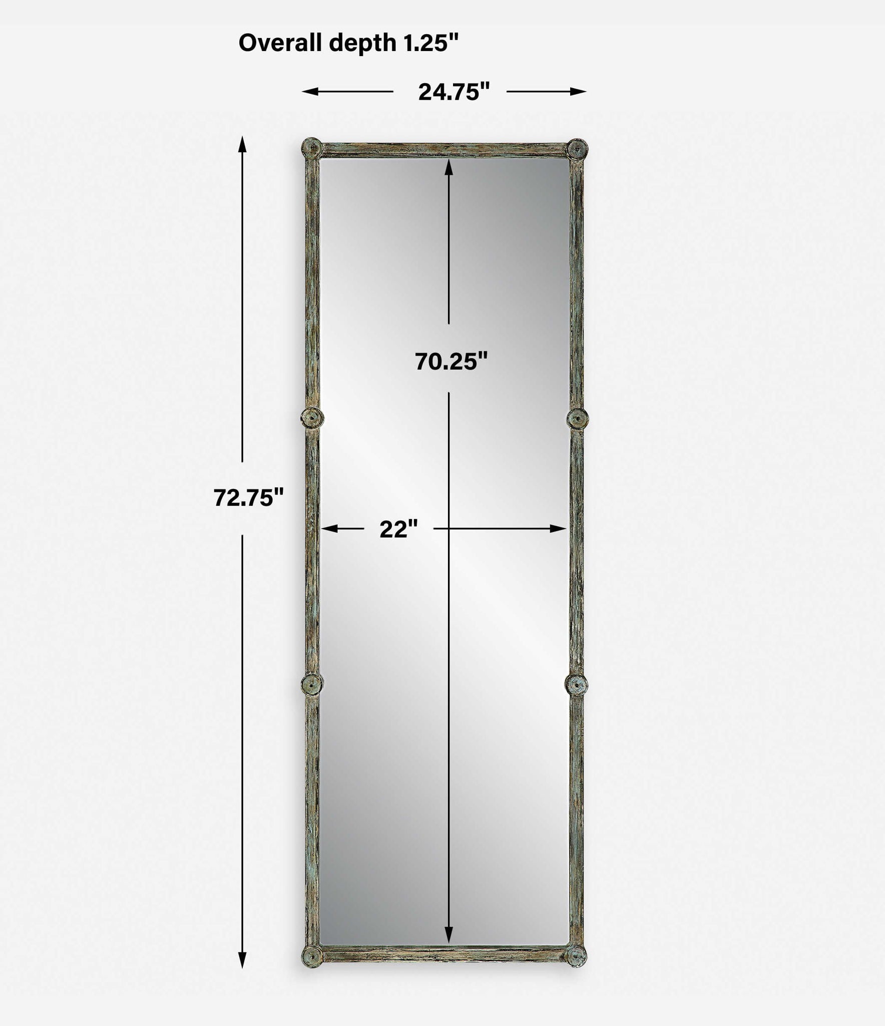 This Mirror Showcases A Traditional Design With Channeled Frame And Medallion Accents Featuring A Patinaed Finish Of Weathered Verdigris Green With Rustic Black Undertones, Antique Distressing And A Light Gray Wash.