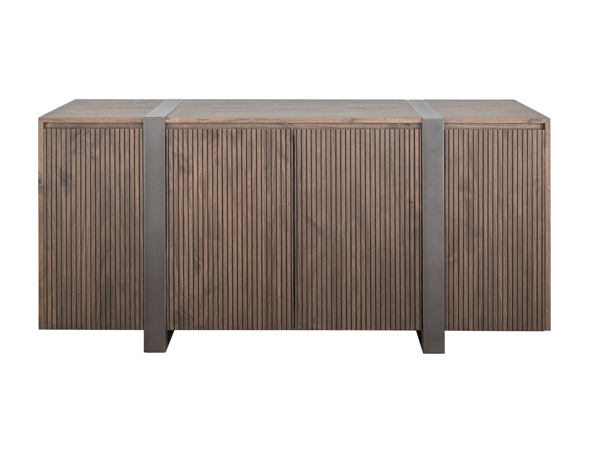 4 Door, Console. The captivating Haab console boasts beautifully channel detailing doors and integrated metal accents with a hidden pull system. The soft, inviting texture of the natural wood grain offers an engaging sensory experience, encouraging you to run your hands along its surface.