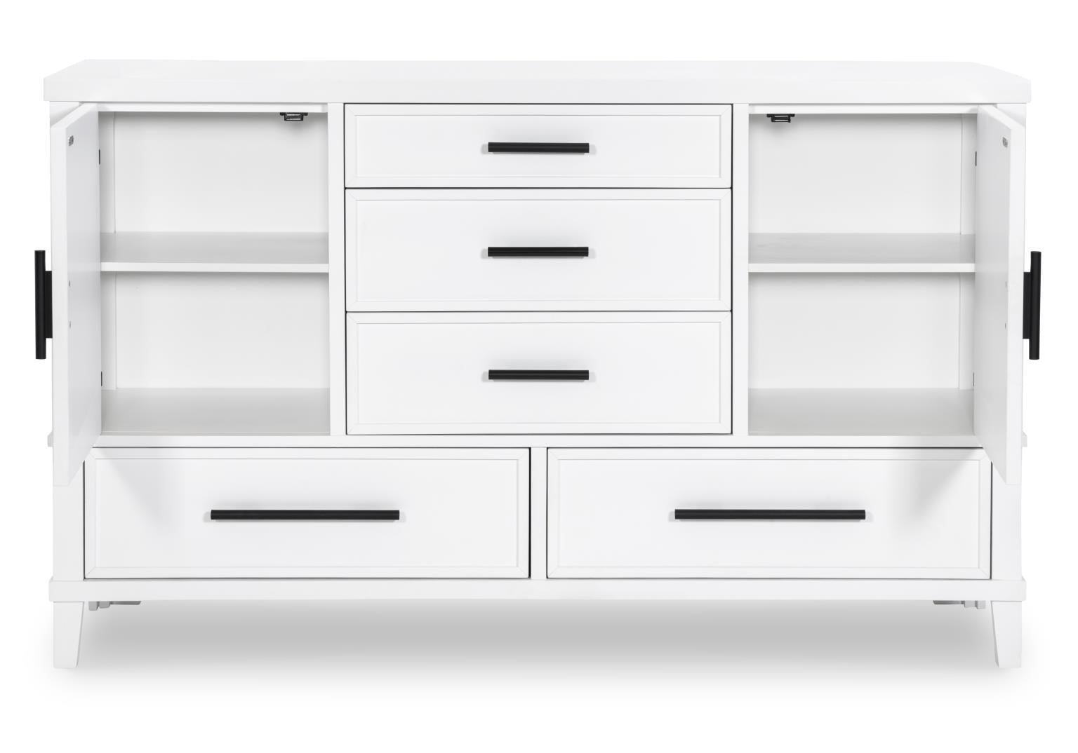 The Horizons bedroom is designed to bring a sense of calm,, comfort,, and effortless elegance into your everyday life. With a soft,, luminous finish and relaxed casual style,, this collection creates a peaceful retreat that feels like it was made just for you. Each piece is beautifully crafted with Select Hardwood Solids and Oak Veneers,, offering both durability and timeless beauty. The look is elevated with striking Mineral Black Hardware,, while the dresser's elegant fretwork design adds just the right amount of artistry and charm. Thoughtful touches like French dovetail drawer construction and smooth ball bearing side glides ensure everything works as beautifully as it looks - quiet,, seamless,, and built to last. At the center of it all is the Panel Bed,, featuring a graceful fretwork design that brings texture and sophistication to your space. Available in twin,, full,, queen,, and king sizes,, it's the perfect statement piece for rooms big and small.