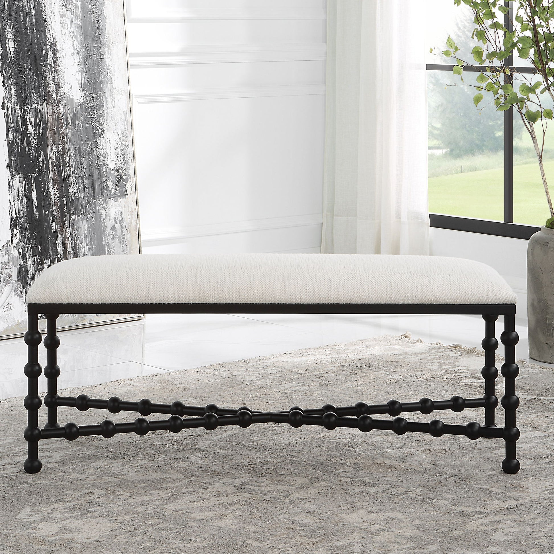 - Sophisticated Style Created By The Whimsical Bubble Legs Ensures This Bench To Stand Out In Any Home. Crafted In Iron With A Satin Black Finish Contrasted With A Cushioned Seat In A Crisp White Textured Polyester Fabric With Performance Treatment.