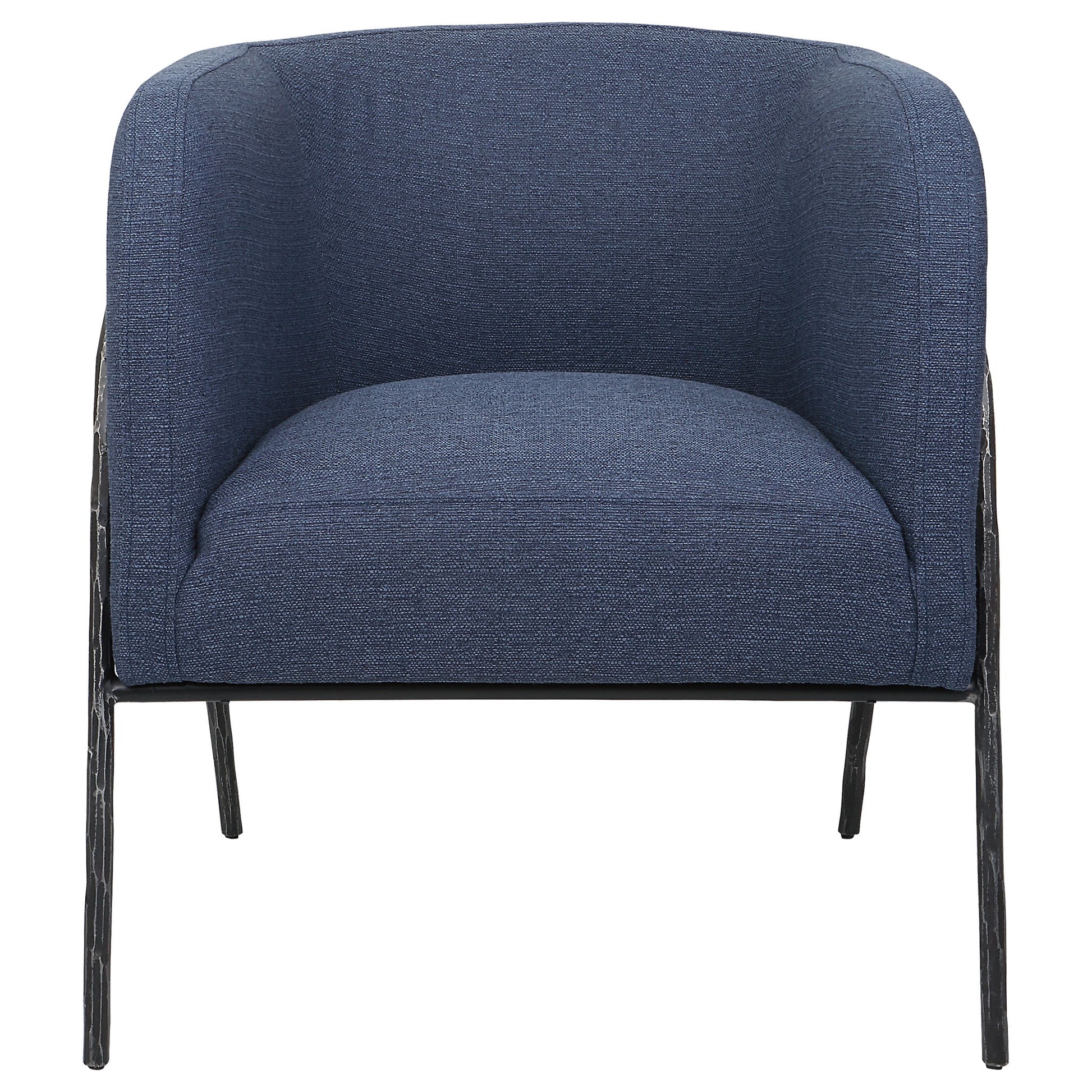 Inspired By Scandinavian Designs, This Barrel Back Style Chair Showcases Elegant Curved Lines With A Chiseled Iron Frame In A Natural Aged Black Iron Finish. A Regatta Blue Polyester Fabric Accents This Modern Look.