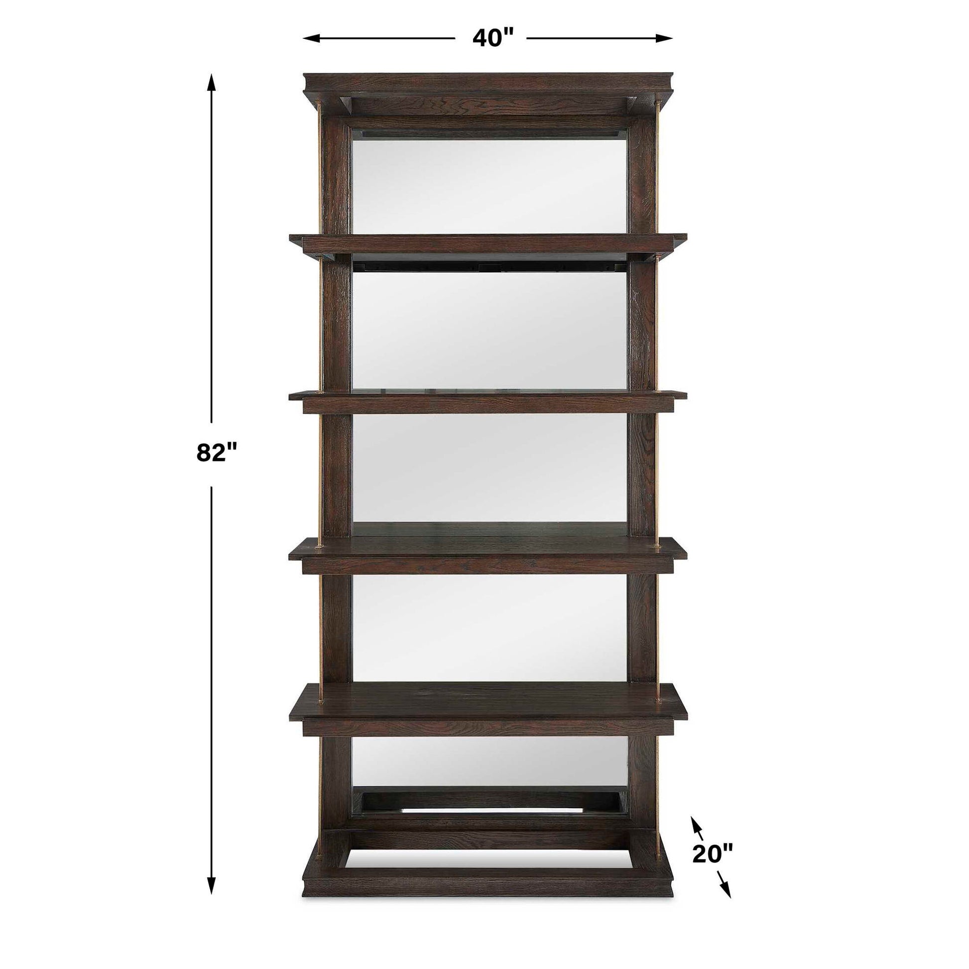 This Elegant Etagere Combines A Classic Dark Walnut Finish With Gold Accents. Crafted From Oak, It Features Four Open Shelves For Displaying Your Favorite Items. The Mirrored Back Adds Depth And Light To Your Space, While The Gold Iron Bars Create A Striking Visual Contrast.