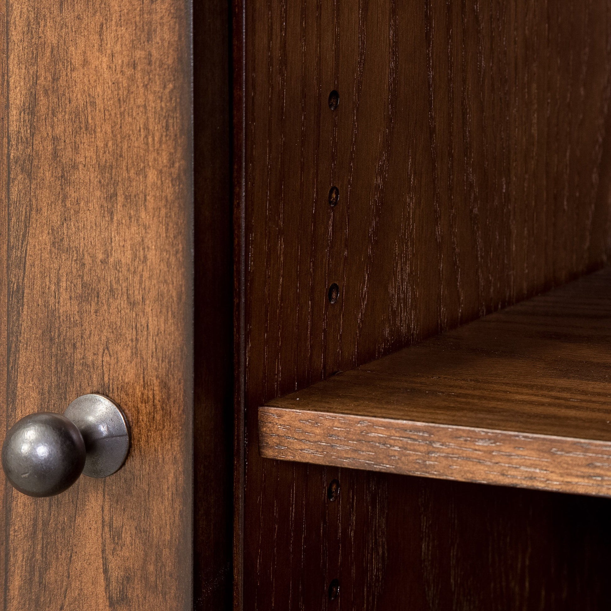 Elevate your space with the casual country style Lakehouse tv console. Crafted of poplar solids and oak veneers, this piece features an oak finish, wire management provisions, an appealing planked top, two wood framed planked sliding barn doors accented with antique brass knob hardware that reveal one adjustable shelf behind each door, an adjustable center shelf, , and is anchored by a tapered leg design. Also available in an alternate finish, this tv console with its golden oak finish has universal appeal.