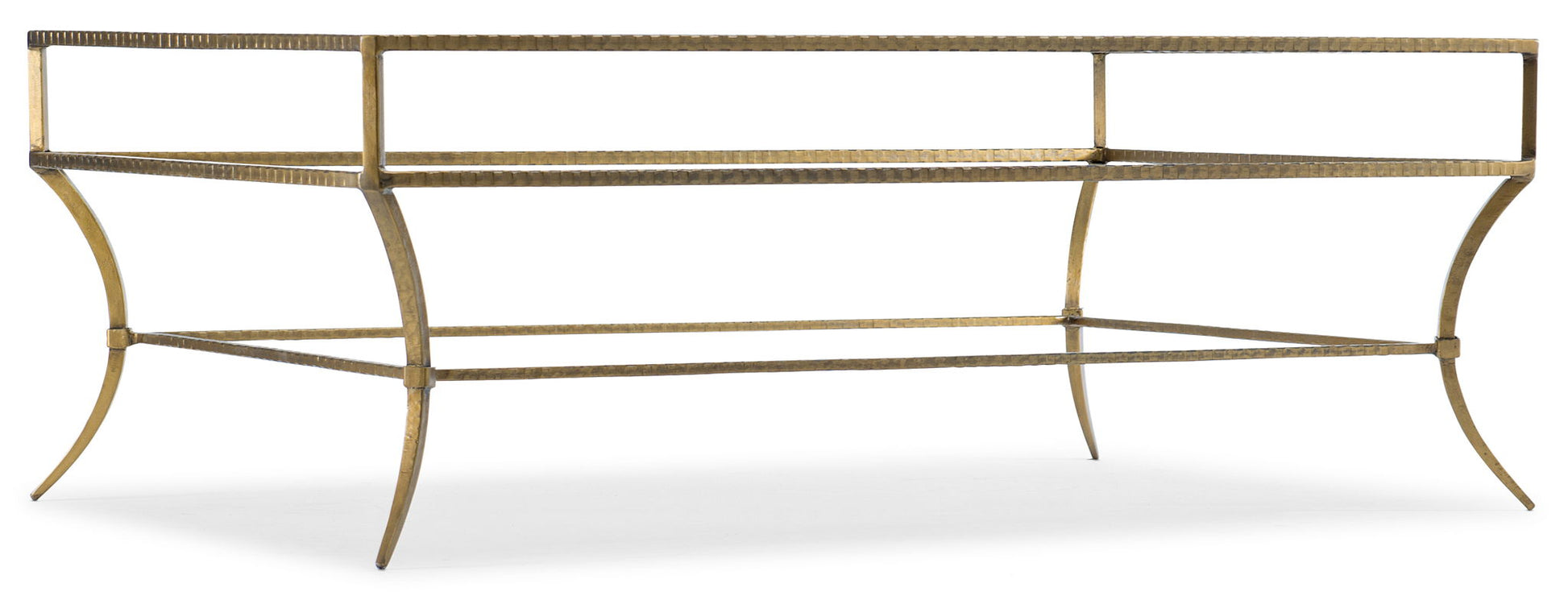 Lighter than air with a dash of bling, the delicately-scaled Larueng Cocktail Table combines a hammered iron frame in a gold finish with a tempered glass top.