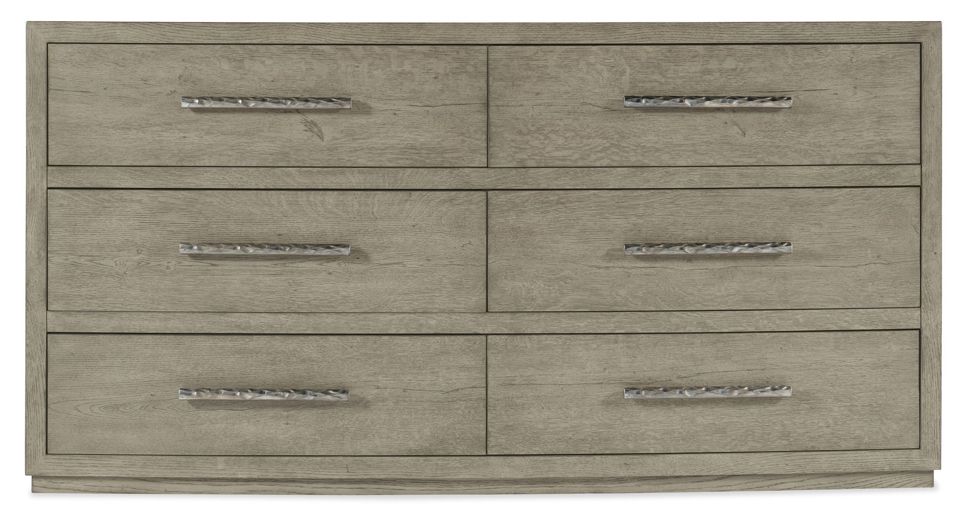 With a rustic weathered finish and clean modern lines, the Chimney Gap Dresser has six self-closing drawers, with the top two drawer featuring drop-in felt liners and a jewelry tray. The bottom two drawers are cedar lined. Crafted of Oak Veneers, the dresser is finished in the soft smoked gray Mink. Textured metal bar pulls in an antique pewter finish add an organic accent.