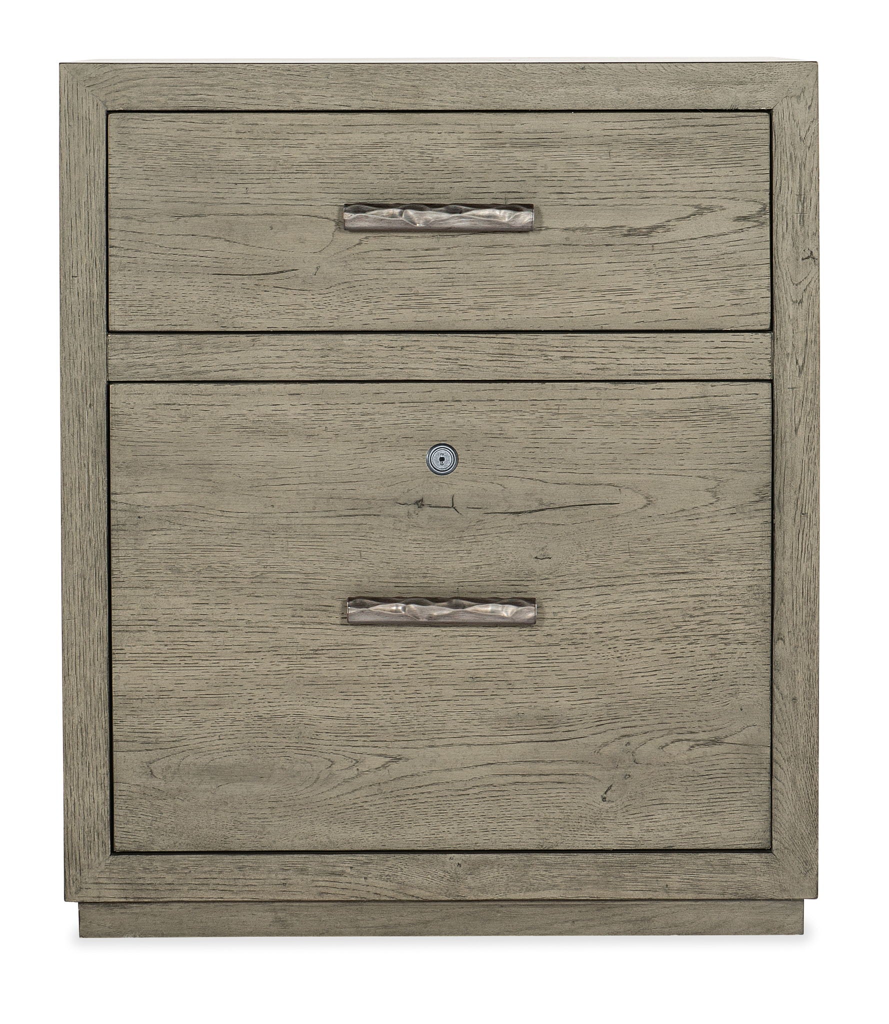 The Linville Falls File pairs the rustic weathered smoked gray Mink finish with an organic grain pattern and clean modern lines. Crafted of Oak Veneers, the File is accented with textured metal bar pulls in an antique pewter finish and features a top utility drawer and a lower locking file drawer with pendaflex filing system. Finished on the back so it can be floated in a room, it can be used alone or with coordinating modular pieces including desks, corner desks, a lateral file and etagere.