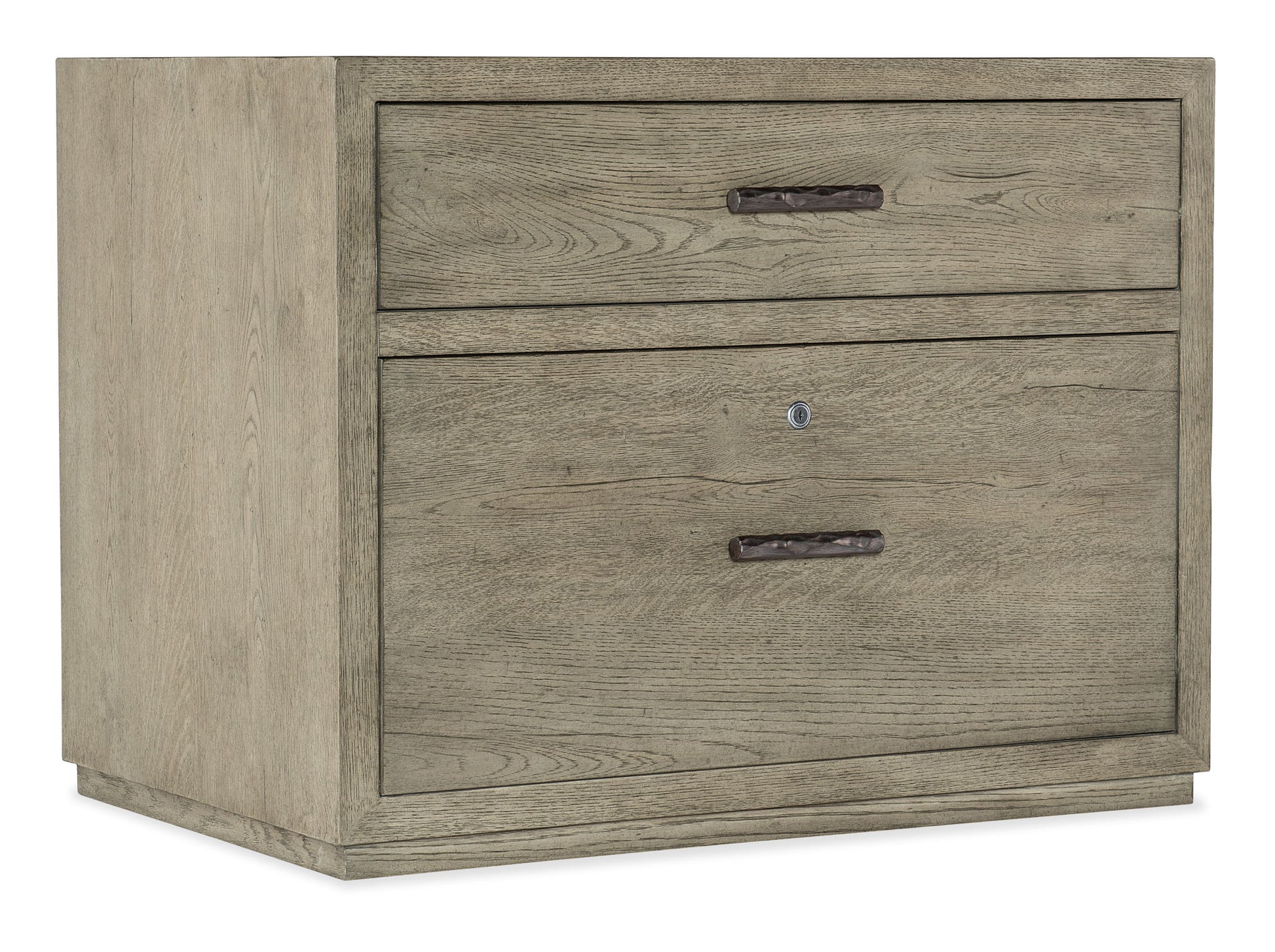 The Linville Falls Lateral File pairs the rustic weathered smoked gray Mink finish with an organic grain pattern and clean modern lines. Crafted of Oak Veneers, the lateral file is accented with textured metal bar pulls in an antique pewter finish and features a top utility drawer and a lower locking file drawer with pendaflex filing system. Finished on the back so it can be floated in a room, it can be used alone or with coordinating modular pieces including desks, corner desks, and an etagere.