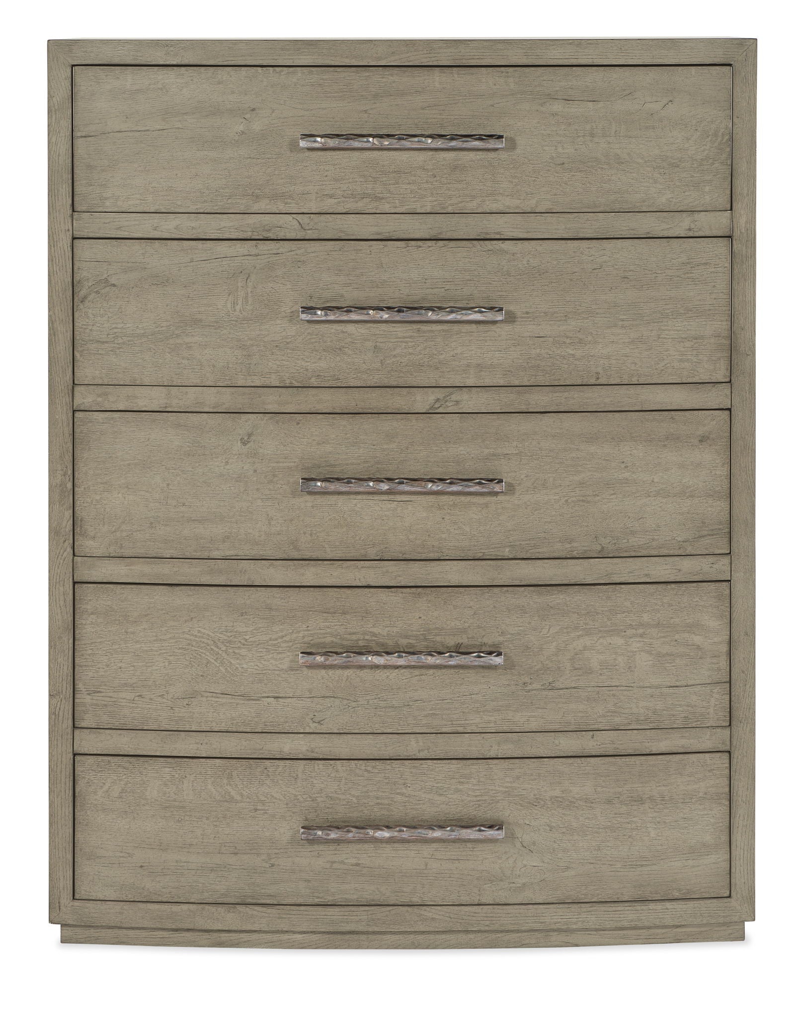 With a rustic weathered finish and clean modern lines, the Pisgah Chest has five self-closing drawers, with the top two drawers featuring drop-in felt liners, and the bottom drawer is cedar-lined. Crafted of Oak Veneers, the dresser is finished in the soft smoked gray Mink. Textured metal bar pulls in an antique pewter finish add an organic accent.