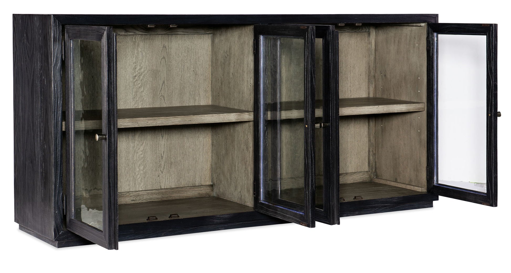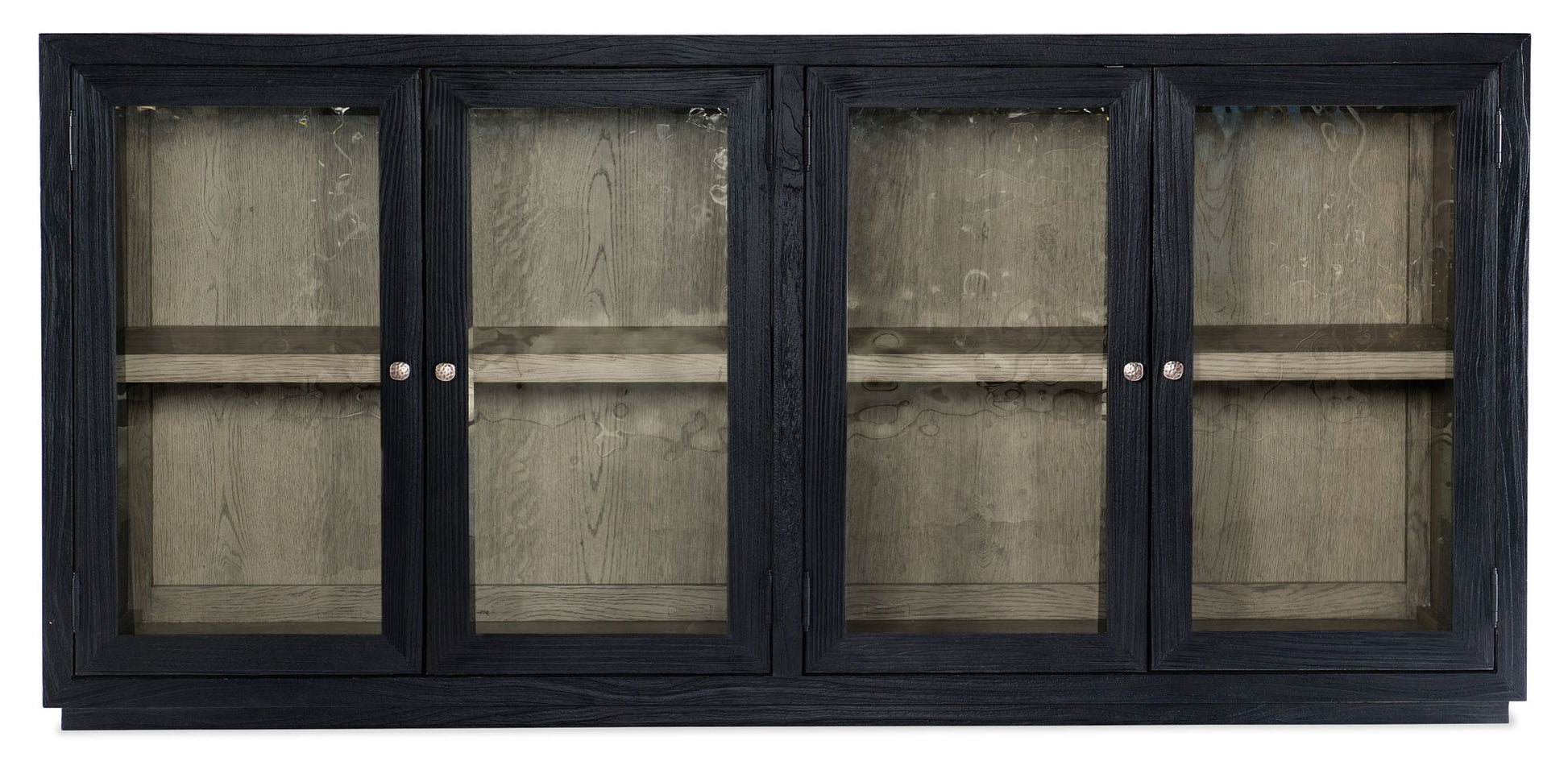 With the aura of a rustic mountain cottage, the Linville Falls Server has four wood-framed doors with seeded glass inserts and two adjustable shelves behind each pair of doors. Crafted of Pine Veneers, the Server has a charred black finish achieved through Shou Sugi Ban, a Japanese technique that creates a look resembling burnt wood. The interior is finished in Mink, a soft smoked gray. Textured metal par pulls are in an antique pewter finish.