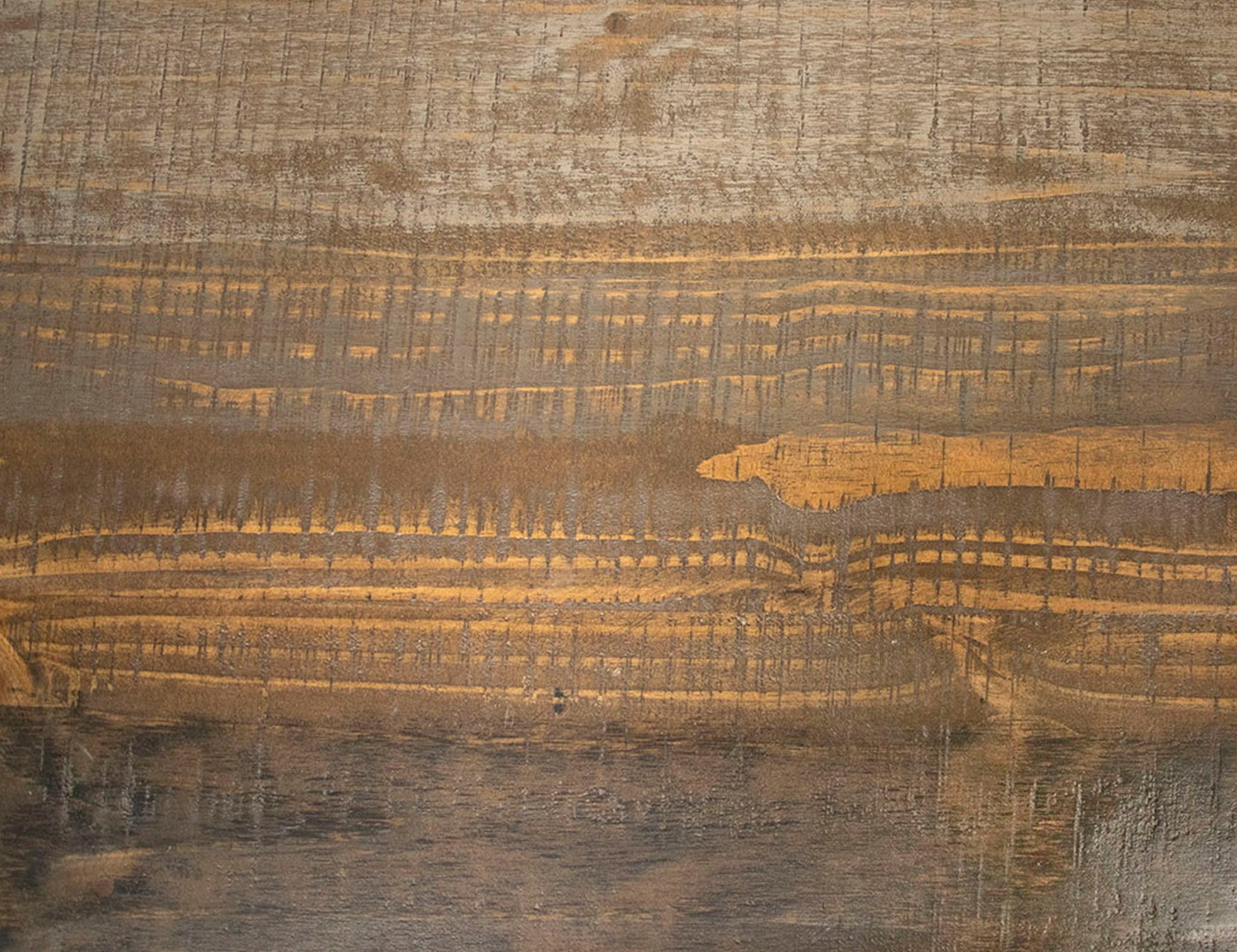 - Multi-step hand-painted water-based acrylic lacquer finish in gray and brown tones for an updated “reclaimed wood” look.