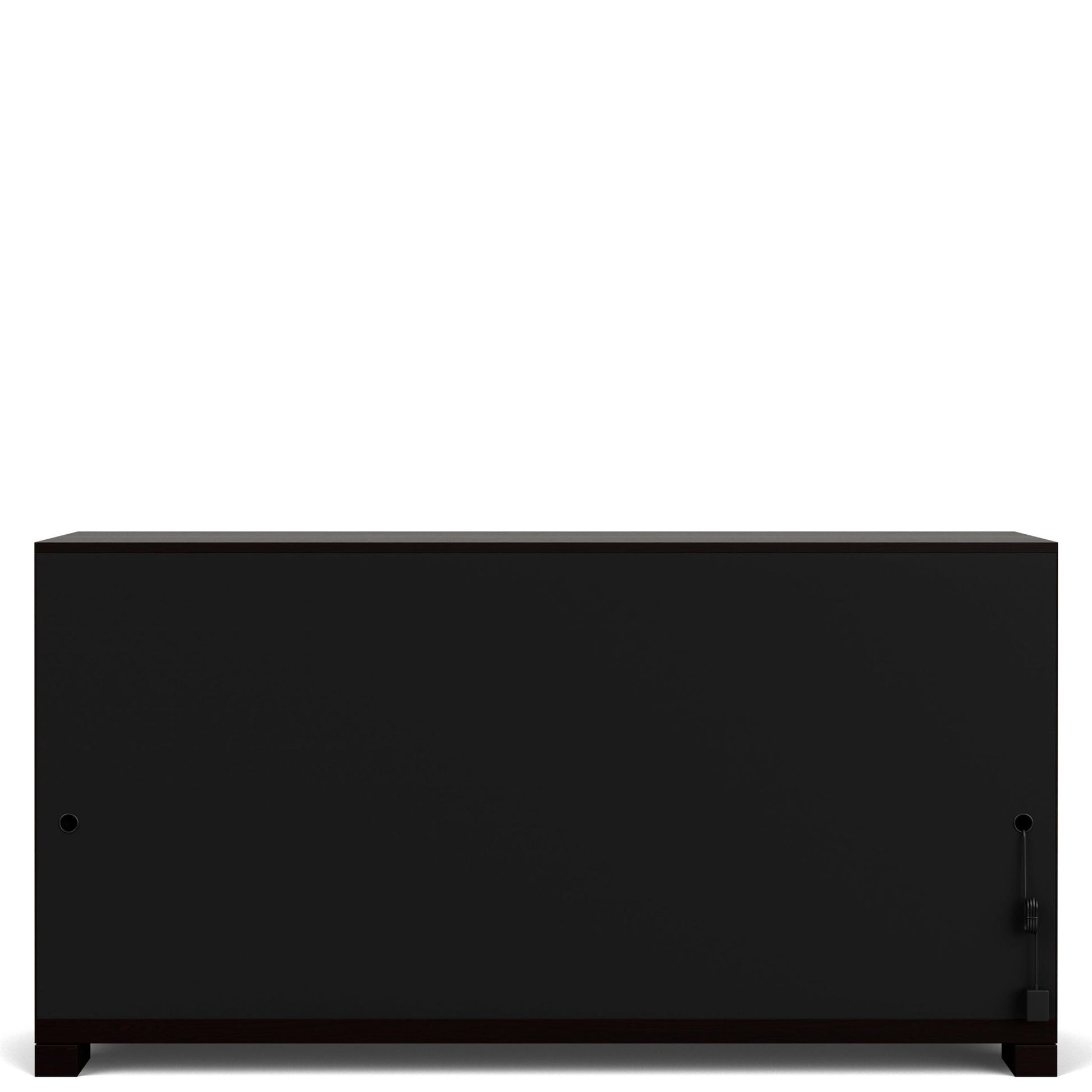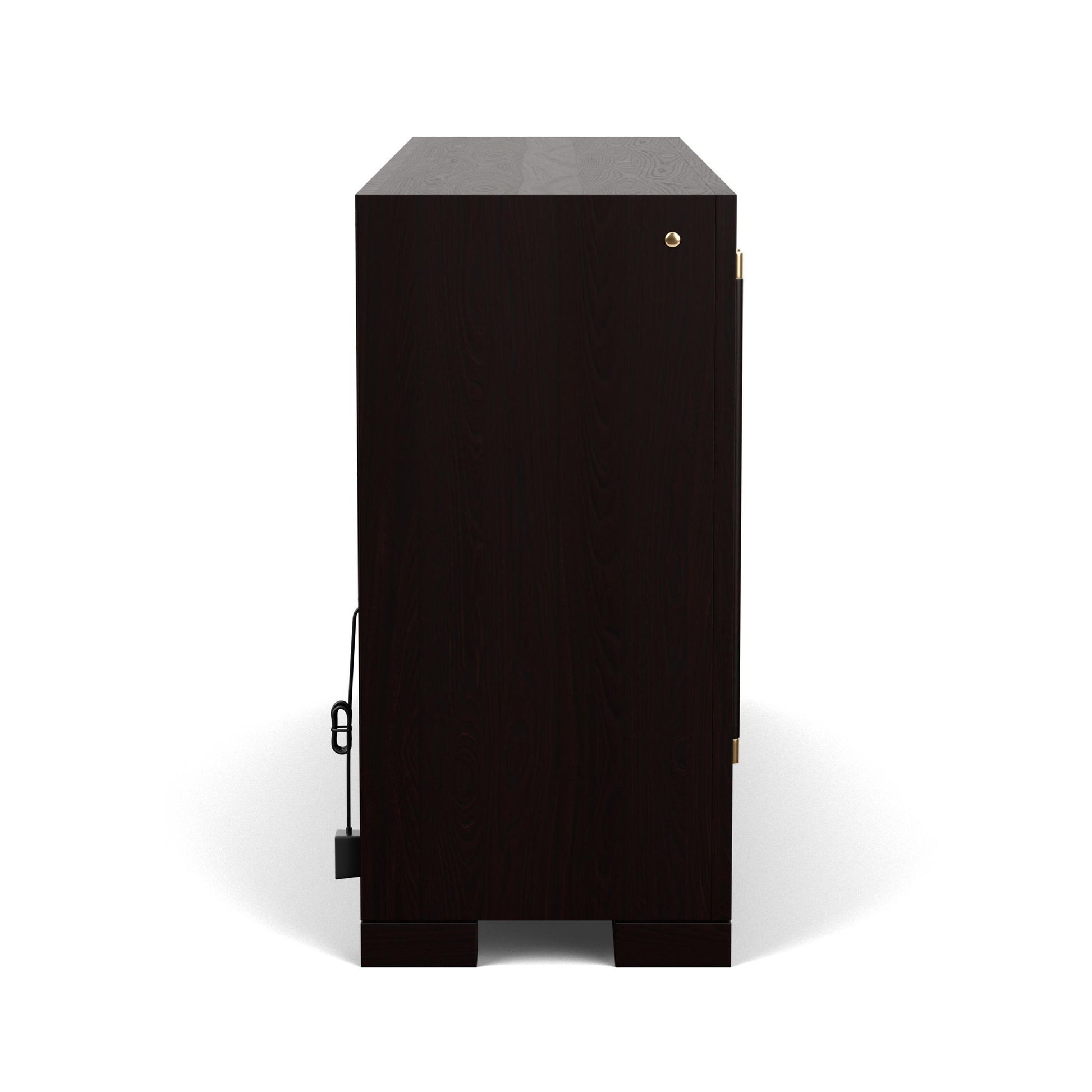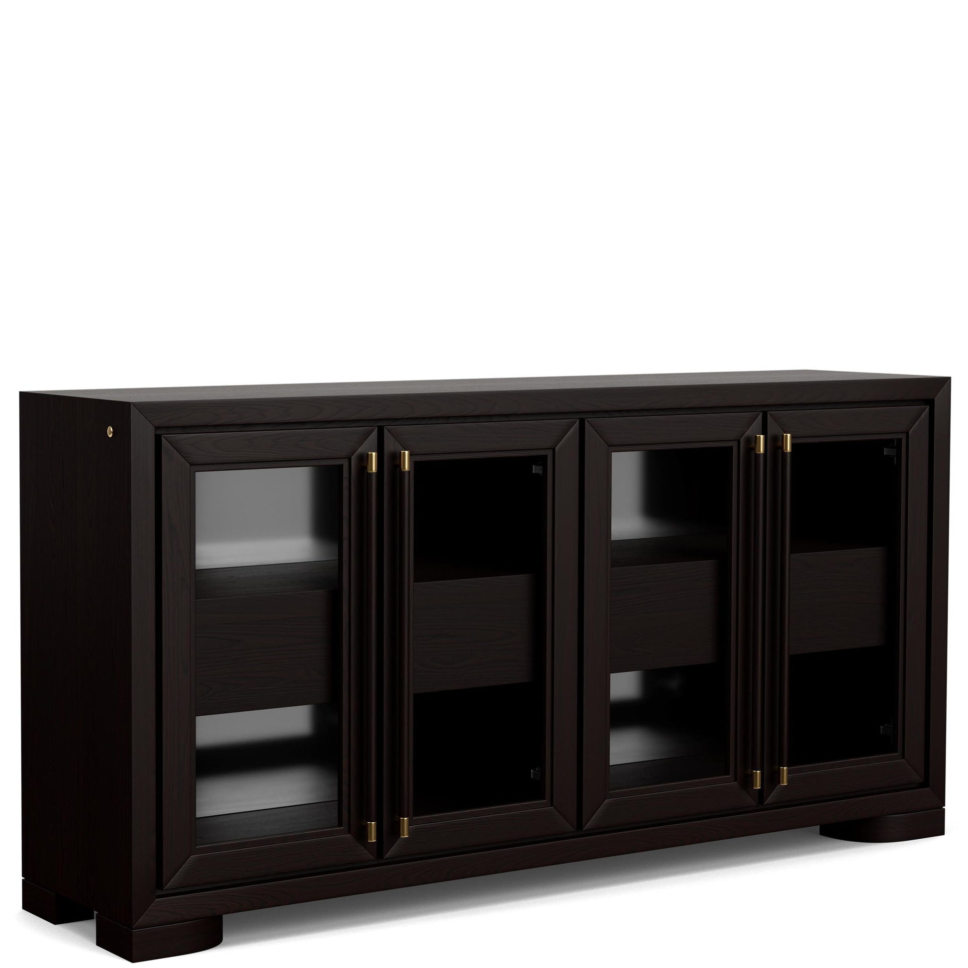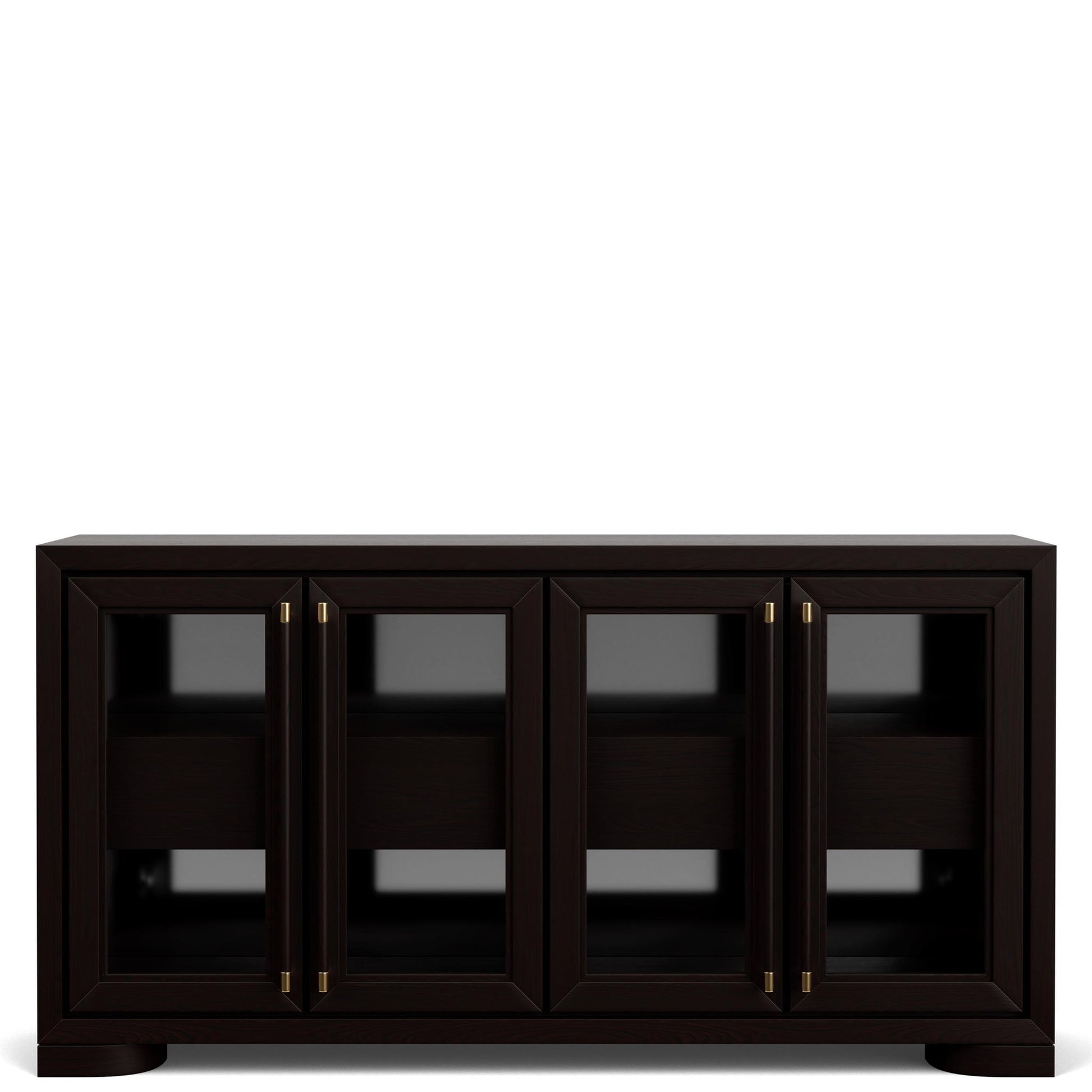 - Four framed glass doors conceal 2 drawers and 2 shelves