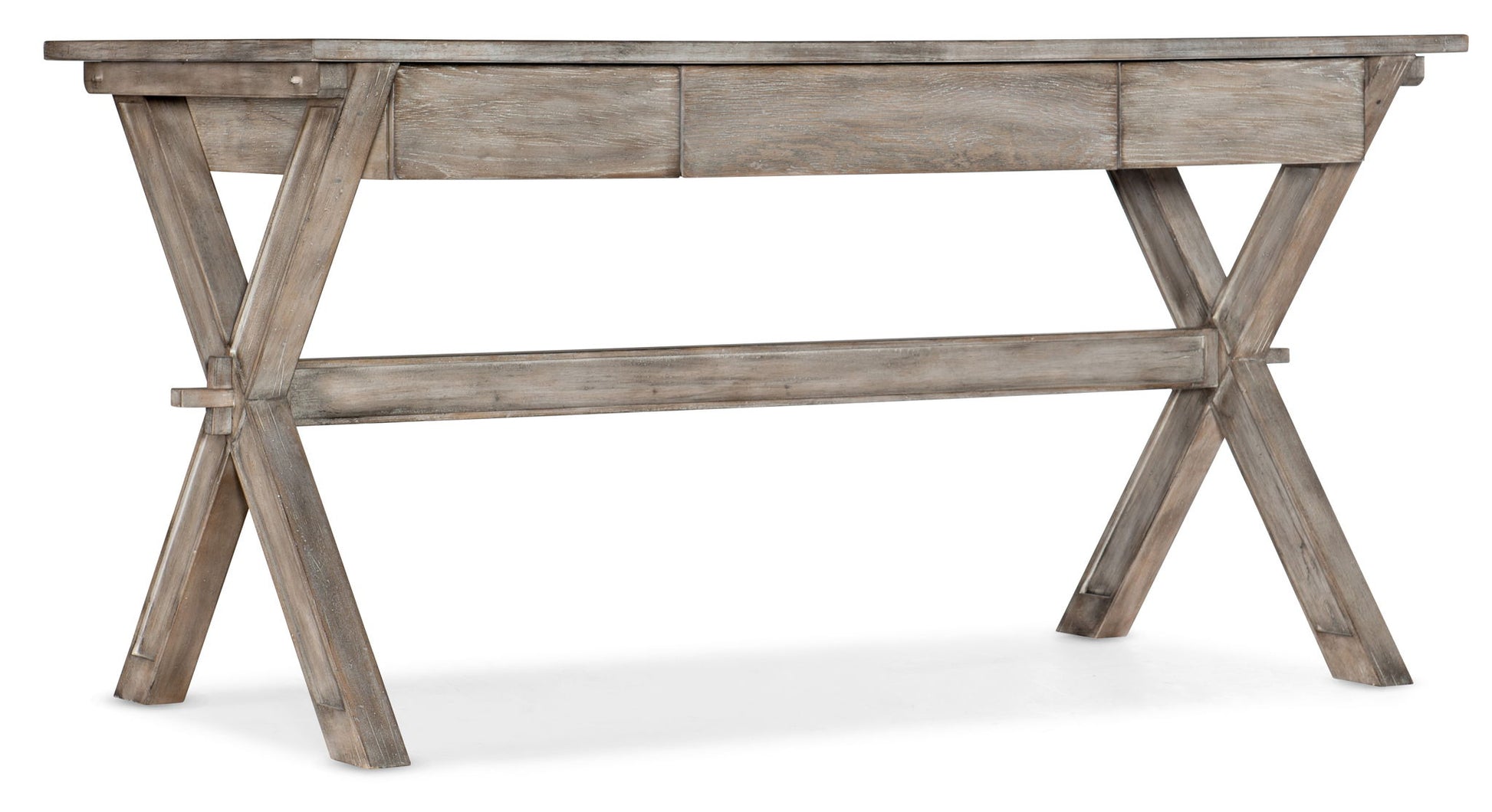 The classic sawhorse desk gets sophisticated with this chic writing desk with an X-base design and crafted of Oak Veneers in a soft light wood finish. There’s one drop-front keyboard drawer.