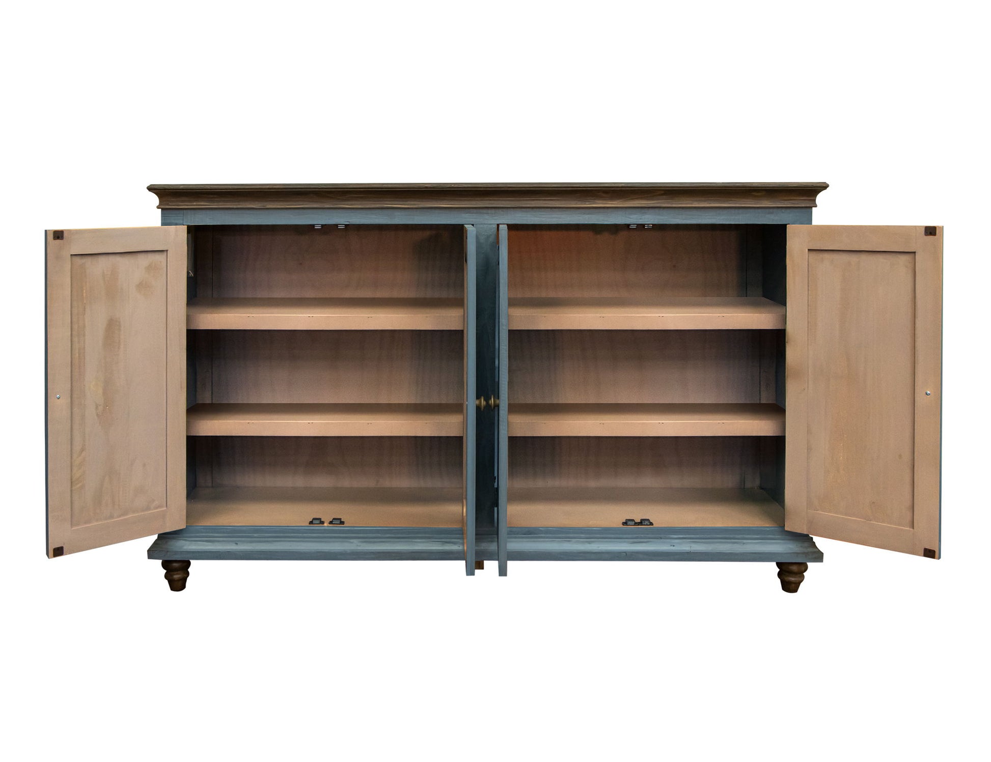 4 Doors Console. Crafted from pine wood, the Margot console showcases a sleek, clean-lined design complemented by beautifully hand-turned bun feet. Offering a spectrum of shades, this console caters to diverse tastes and preferences, ensuring a perfect match for any space.