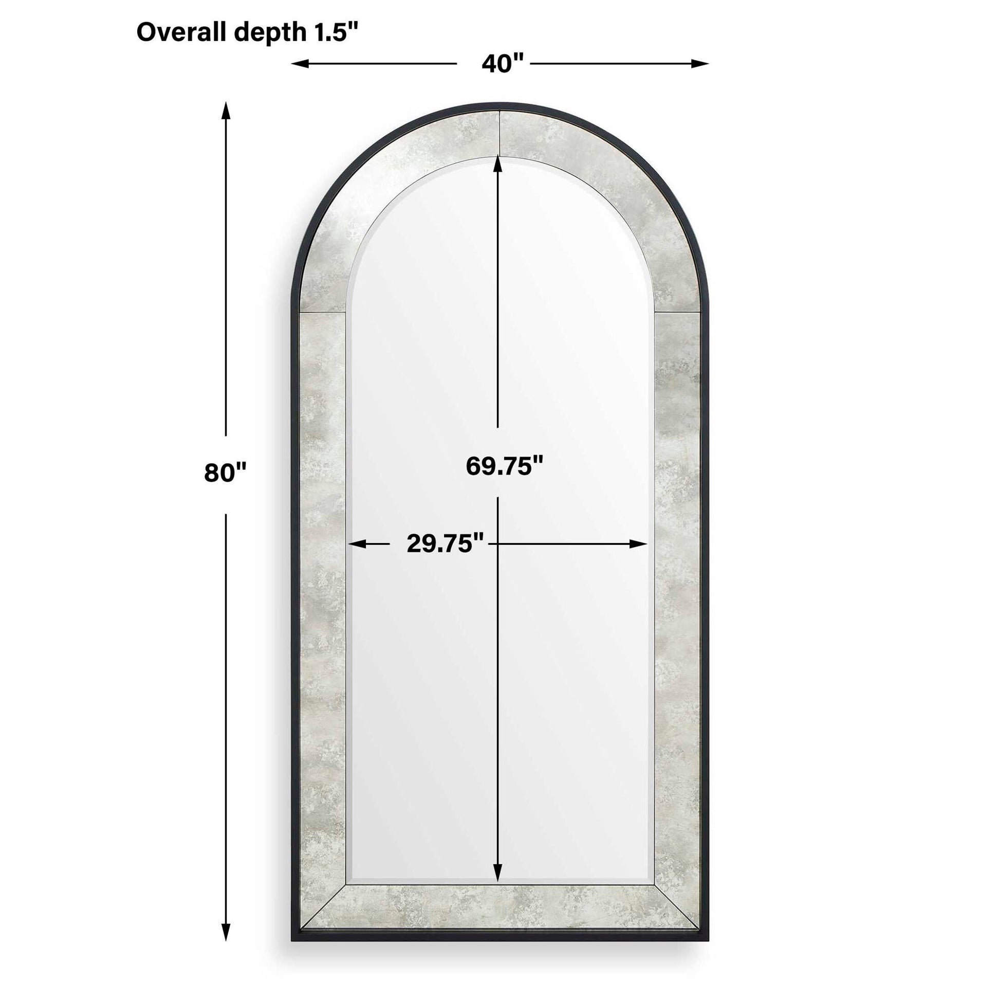 This Oversized Arch Mirror Features Antique Style Mirror Wrapping The Outer Edge Encased By A Thick Black Iron Frame.