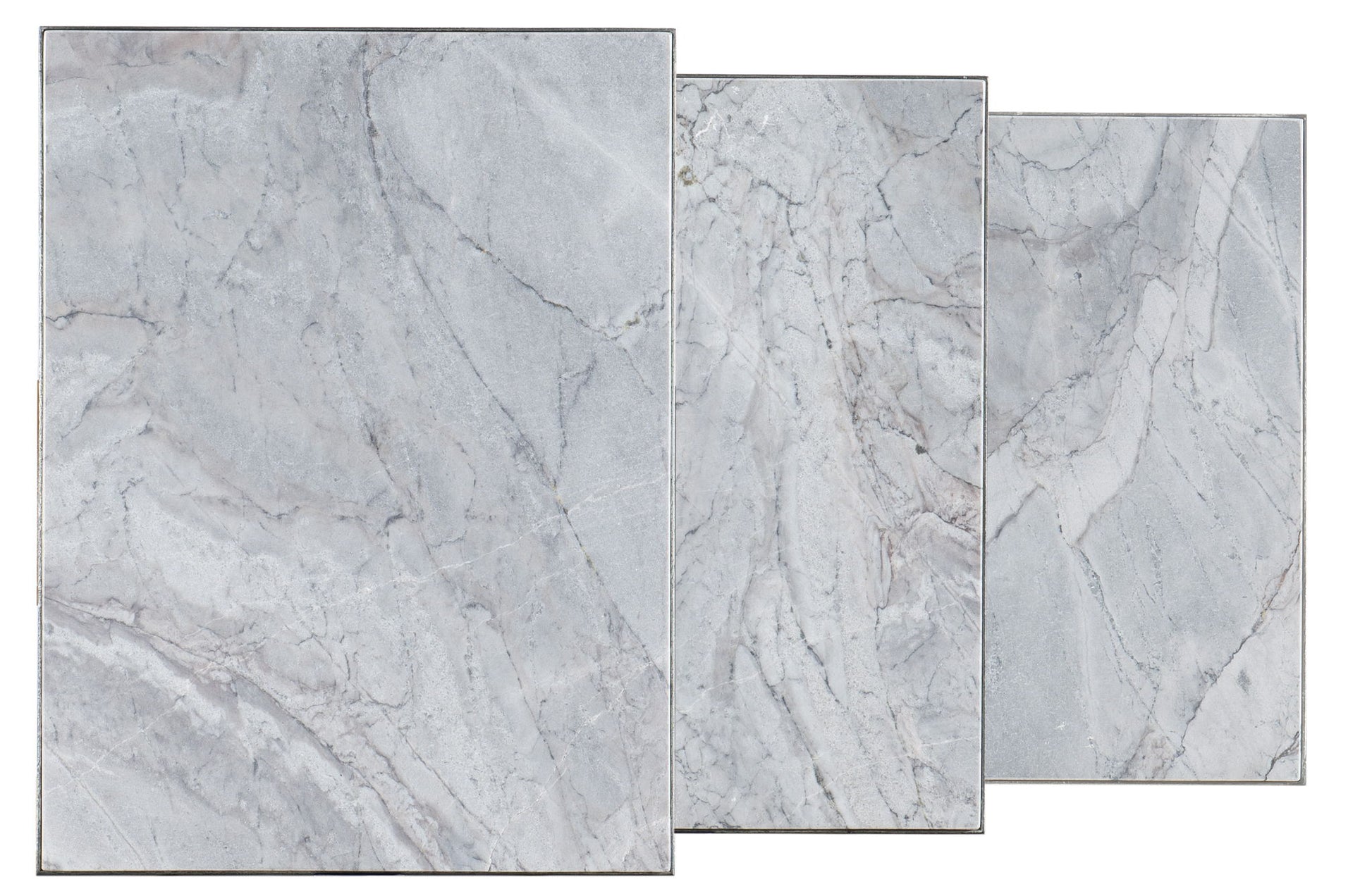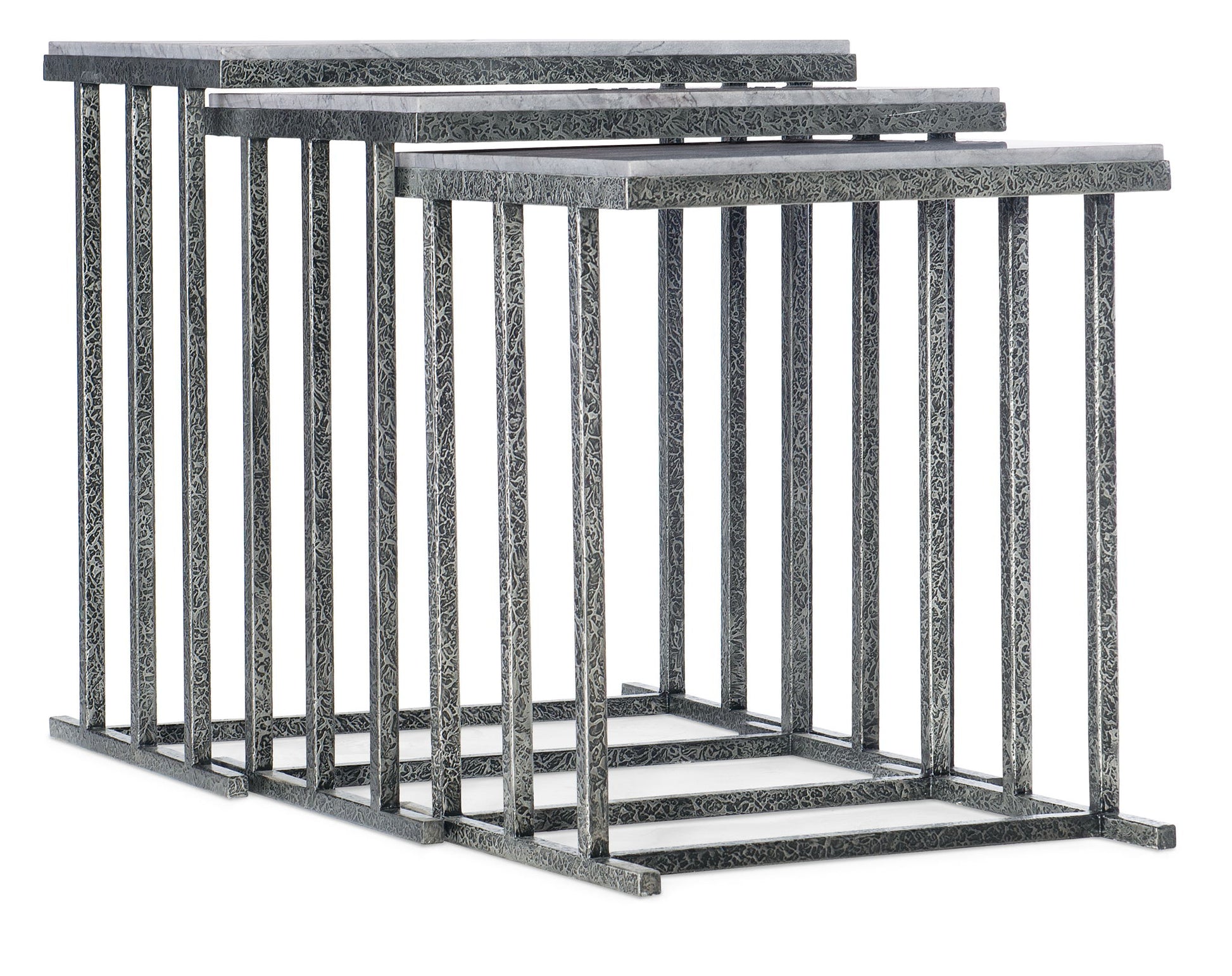 With the look of metal tapestry, the set of three Bianca Nesting Tables have tactile and textural distressed gray metal bases and San Juan Slate stone tops.