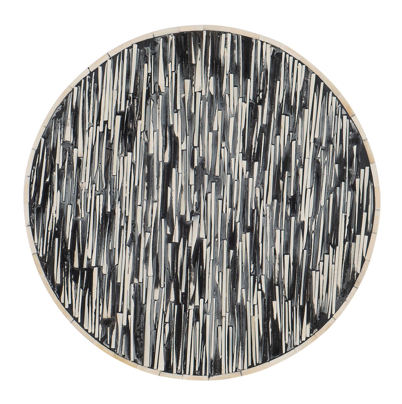 With a global design inspiration and a dynamic palette, the Callum Round Accent Table features white bone inlay over a black finish with a metal plinth base for a world-traveled vibe.