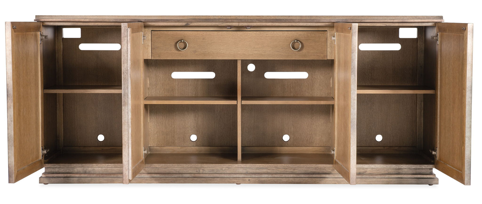 - One drawer and one adjustable shelf behind pair of center doors