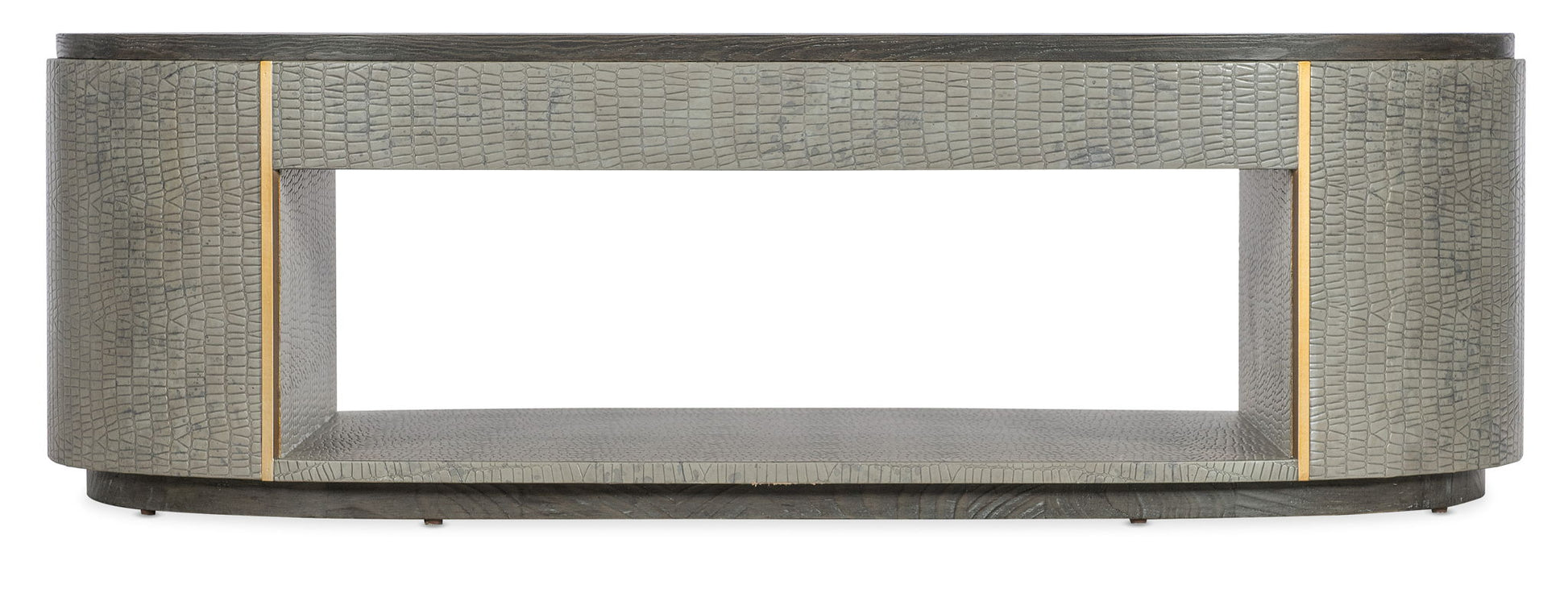 With the design flair of a luxurious fashion accessory, the Dylian Coffee Table has a gray crocodile exterior with gold metal accents and a dark wood top and base. Crafted of Pine Veneers and Robus Leather, it has an oval shape with an open shelf area.