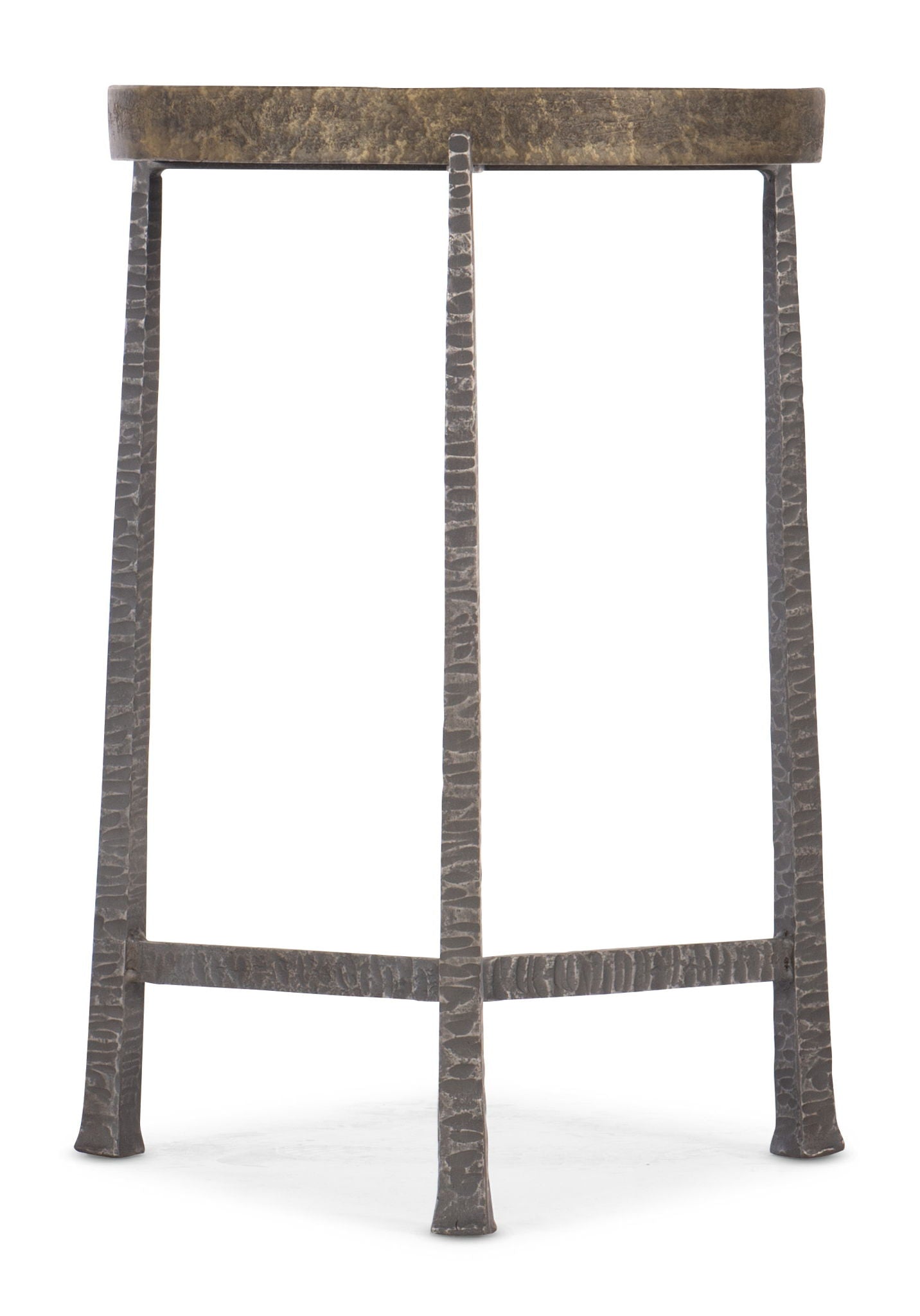 With a handcrafted appeal, the Funda Accent Table combines organic and industrial influences in a convenient, compact 16 ½ by 16 ½ round footprint. Crafted of hammered iron and cast aluminum in a distressed gold metal finish, the top sits on a metal base.