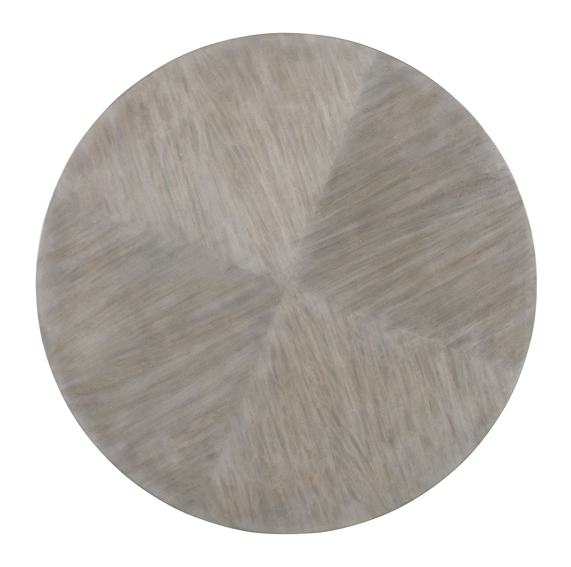 Futuristic and fashion-forward, the round Guilded Cocktail Table features a stepped design with contrasting silver leaf insets. It is crafted of Figured Primavera Veneers with a gray finish and silver leaf accents on the stepped insets for an artistic designer look.