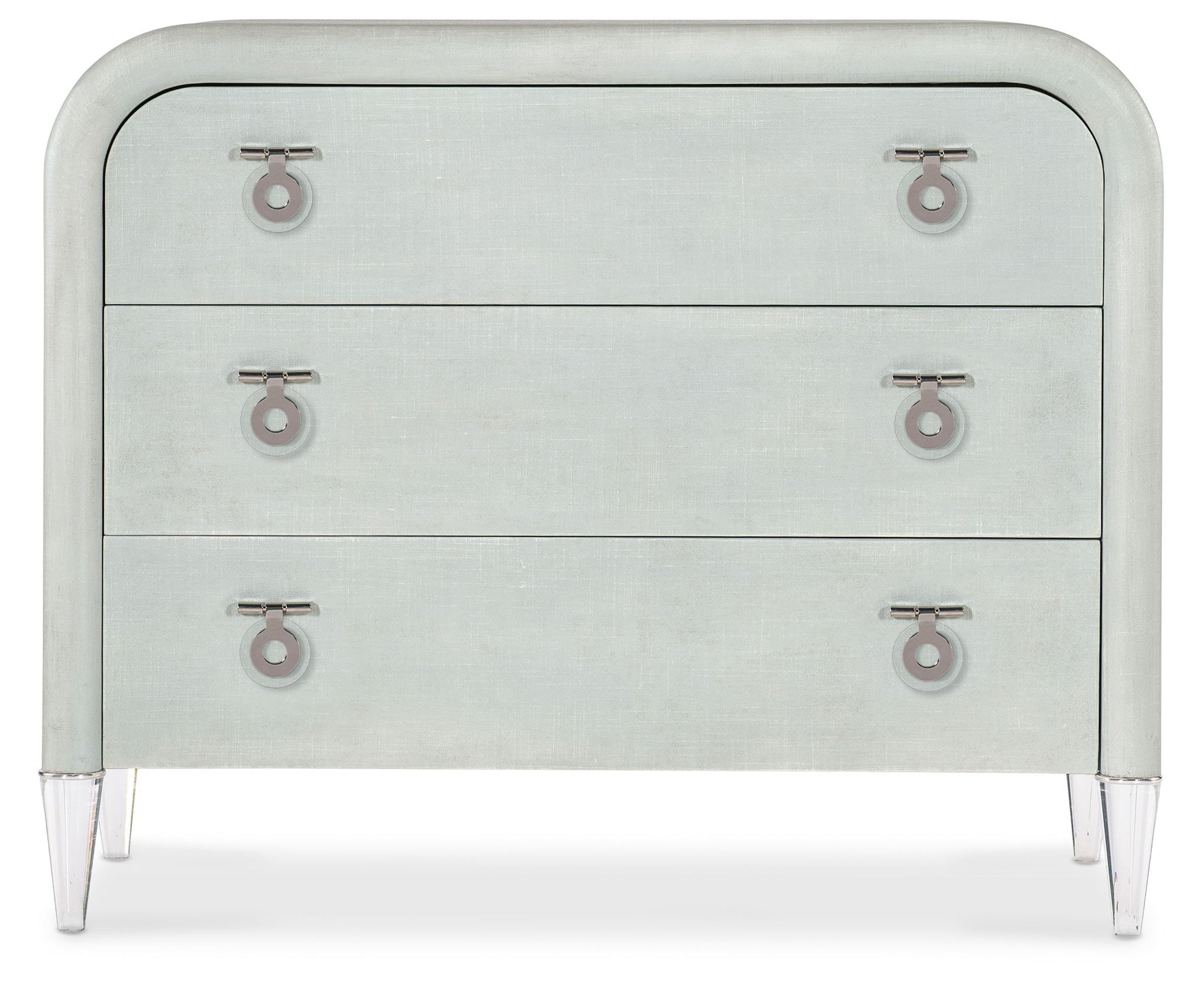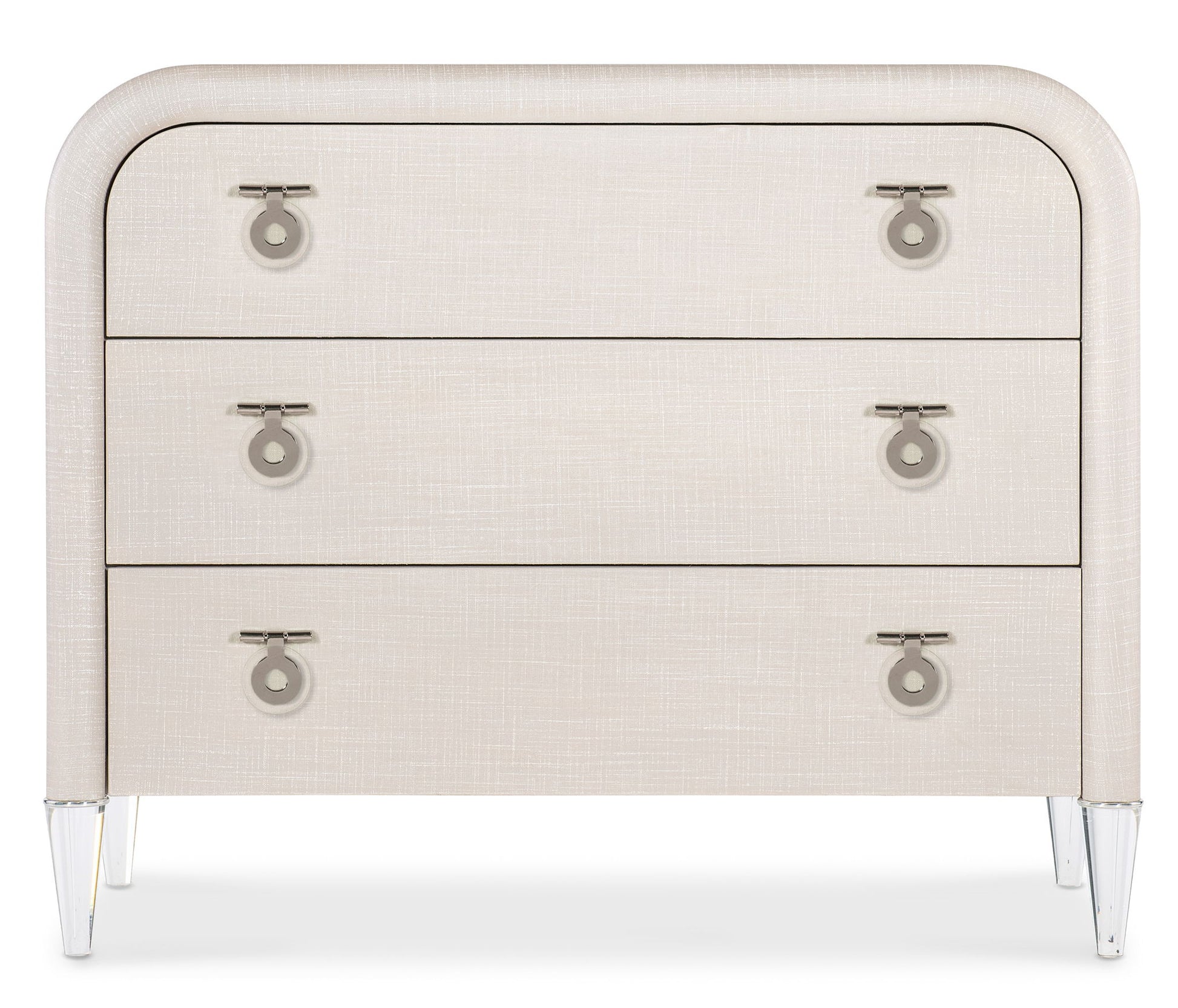 With an understated modern elegance, the Julip Accent Chest is designed with a clean silhouette, clear acrylic legs and metal accents. With a linen-wrapped exterior and drawer fronts and rounded corners, it has chrome-hued, jewelry-like metal drop pulls and three self-closing drawers.