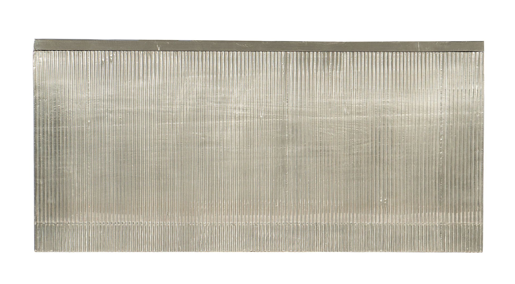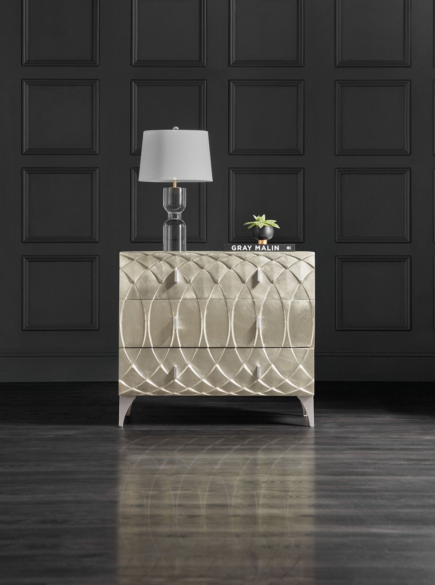 Serene symmetry in a German Silver Foil finish offers tranquil style in a focal piece for any living space. Crafted of Mango Wood with an interlocking ovals motif on the front in German Silver Foil, accented by small silver bar pulls and silver metal legs, the chest has three drawers with side-mounted metal drawer guides.