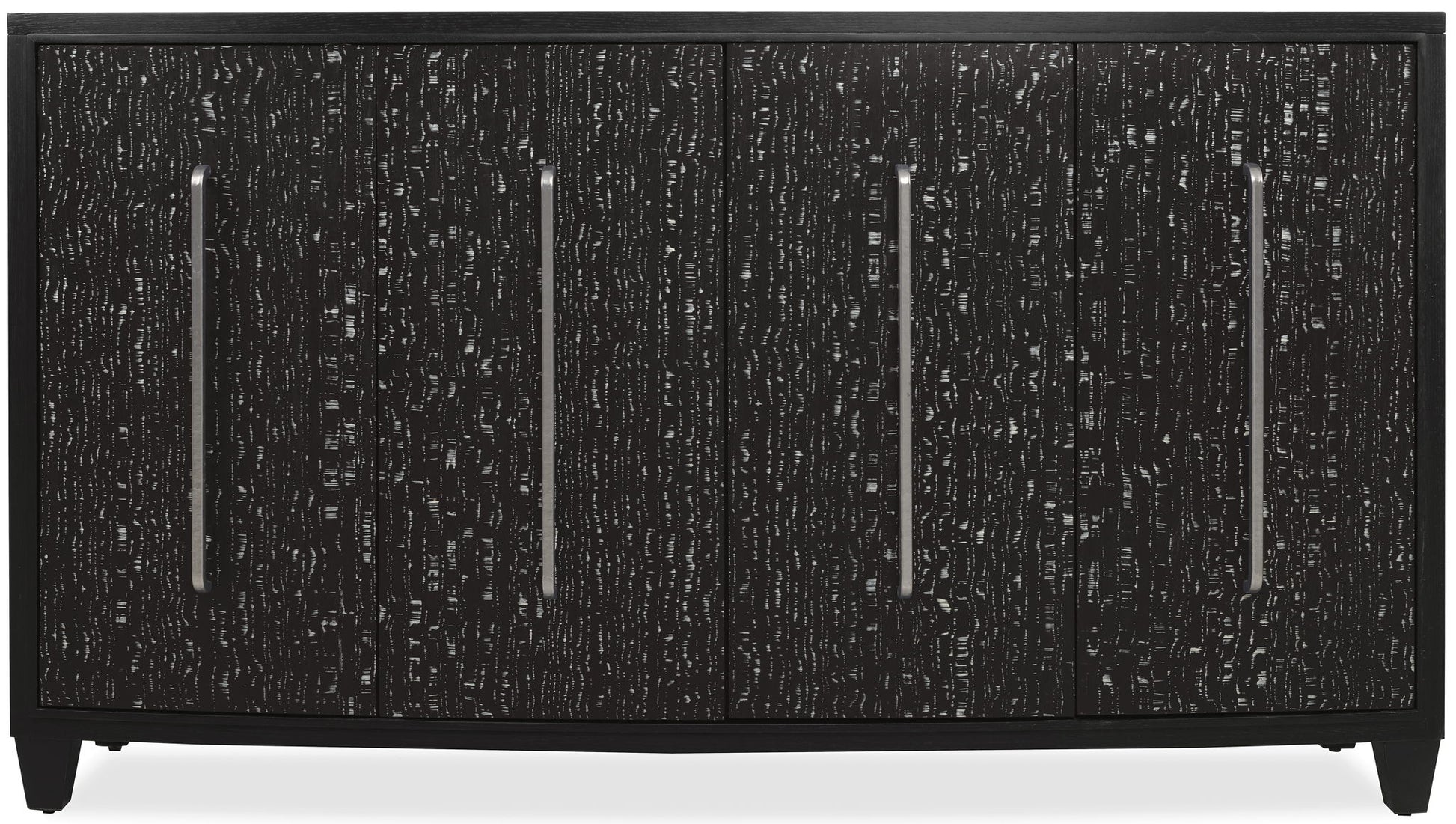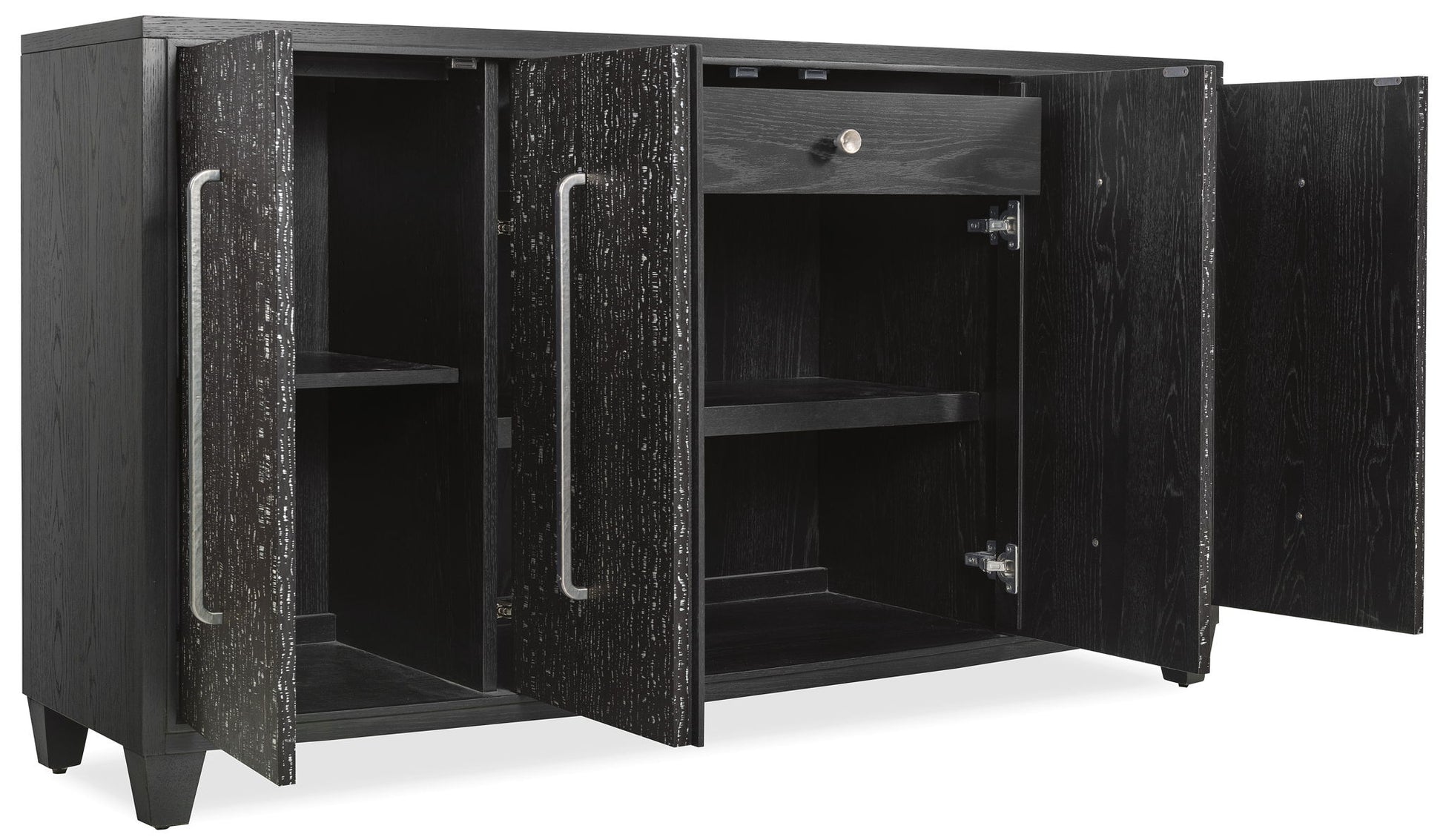 Bold and modern, the Midnight Credenza boasts black-and-white engineered veneer doors, sleek silver hardware, and generous concealed storage. Its four soft-close doors conceal shelves and drawers, offering style and functionality in one artistic package.