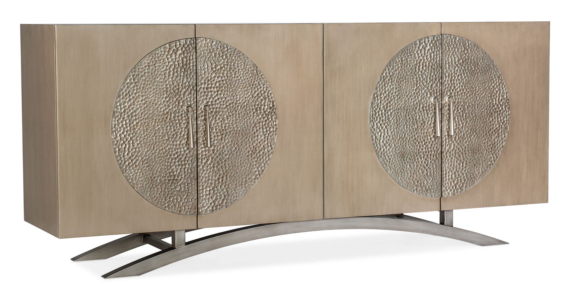 Serene and shimmering in a palette of silver and champagne, the Nolita Four-Door Entertainment Console is a class act for any space. Crafted of Maple Veneers, resin and metal, the console has a champagne finish with side-by-side medallion-like inserts and metal teardrop pulls in a pewter finish, along with a pewter base. The four doors have soft-close hinges, and there’s one adjustable shelf behind each pair of doors, along with a ventilated back panel and a power supply. Accommodates up to a 75-inch TV.