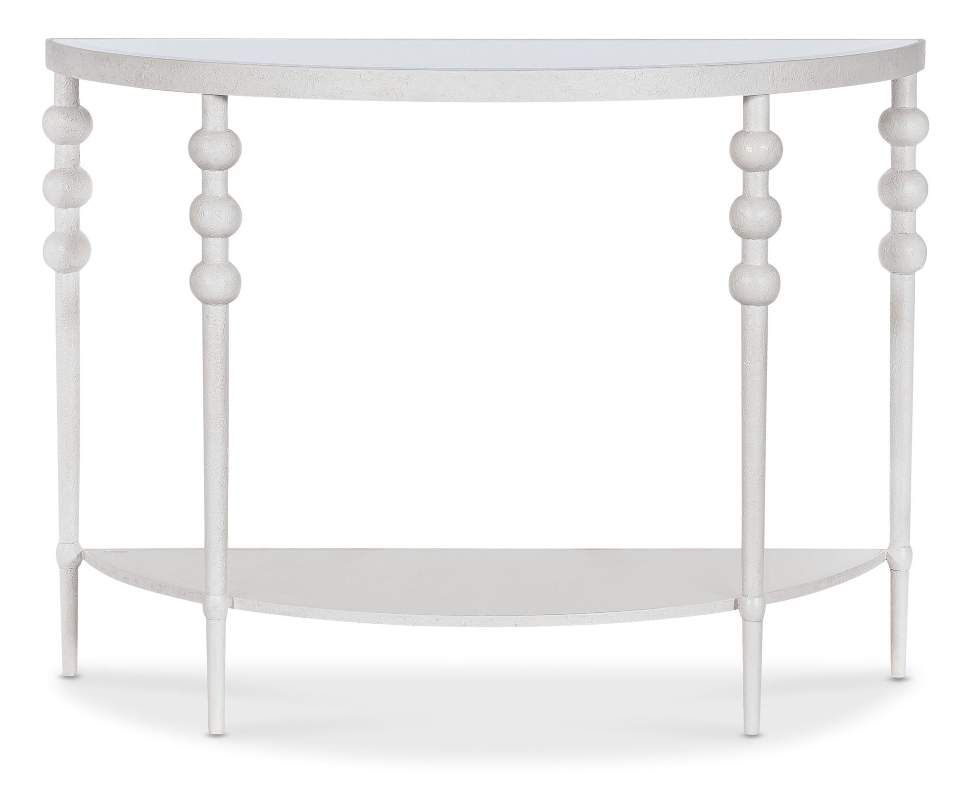 This half-moon console table offers soft sophistication with its white textured finish and beveled white-glass top. A single lower shelf enhances its utility, while the demilune shape makes it ideal for narrow spaces.