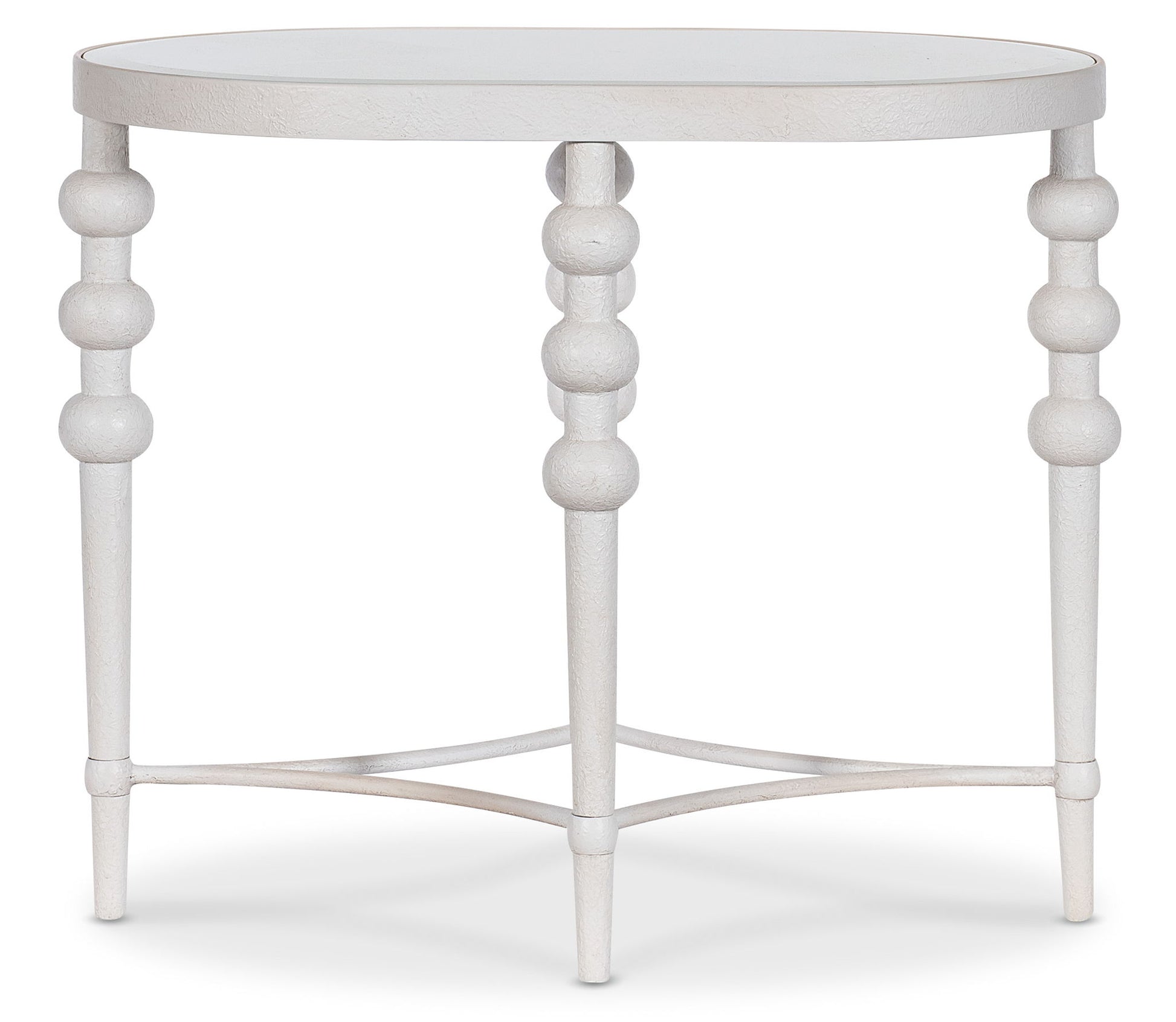 With its white textured finish and beveled glass inset, this oval end table brings light and elegance to your décor. Ideal for minimalist or coastal-inspired spaces.