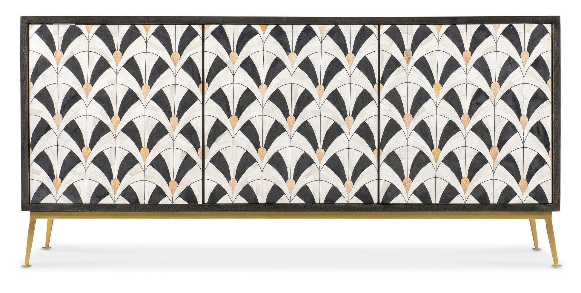 The striking staccato style of the Renee Credenza is expressed with a black wood finish accented by beige, brown and bone inlay on the door fronts. Crafted of Mango Wood, the credenza has 3 doors with touch latches, one fixed shelf behind each door and wire management holes in the back. A gold metal base and legs complete the eclectic design.
