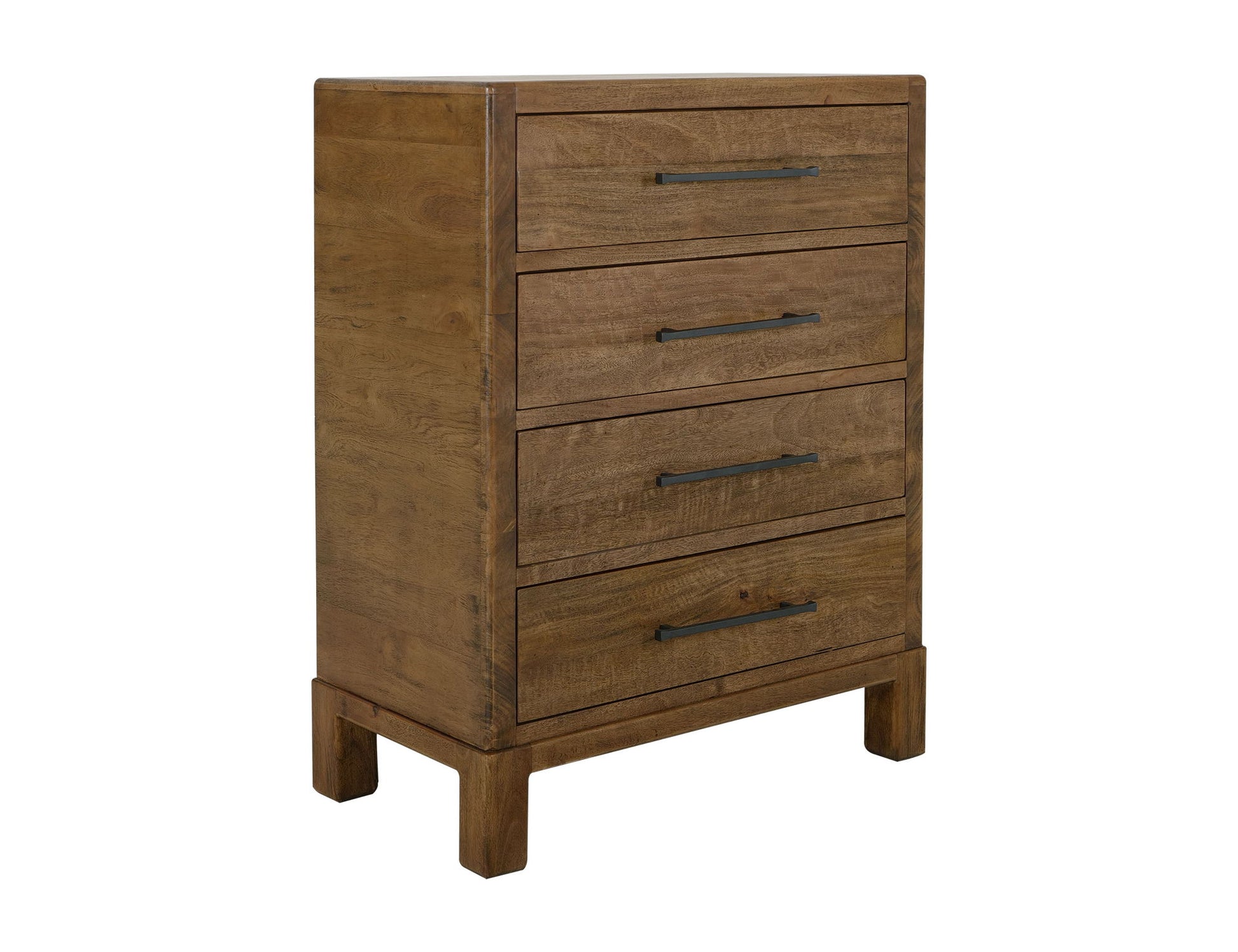 4 Drawer, Chest. The Merida Collection features an exquisite bedroom set that perfectly fuses sustainability and design, embodying eclectic modern style. Made from environmentally friendly mango and melina wood, it combines beauty and functionality to enhance your space. The brown finish highlights the natural elegance of the wood, creating a serene and inviting atmosphere. The chest features a minimalist design characterized by clean lines and a rectangular shape; it not only offers practical storage solutions but also enhances the aesthetic appeal of your bedroom with its timeless charm. The chest stands on four sturdy legs, ensuring stability and durability. The Merida chest is a versatile addition that complements any bedroom décor.