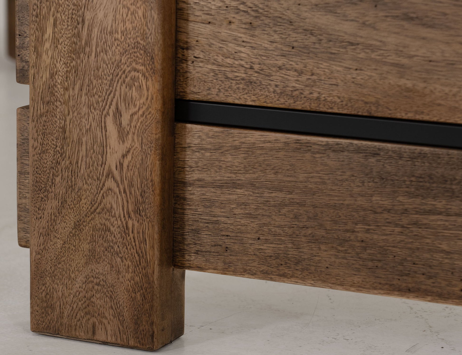 5/0 Queen Platform. The Merida Collection features an exquisite bedroom set that perfectly fuses sustainability and design, embodying eclectic modern style. Made from environmentally friendly mango and melina wood, it combines beauty and functionality to enhance your space. The brown finish highlights the natural elegance of the wood, creating a serene and inviting atmosphere. The slatted headboard and footboard, designed for timeless appeal, is carefully crafted to achieve a sleek and modern look. The metal accents between the slats on both add an industrial touch, enhancing the overall design. This versatile bedroom set complements a wide range of interior styles, making it an ideal addition to any bedroom.