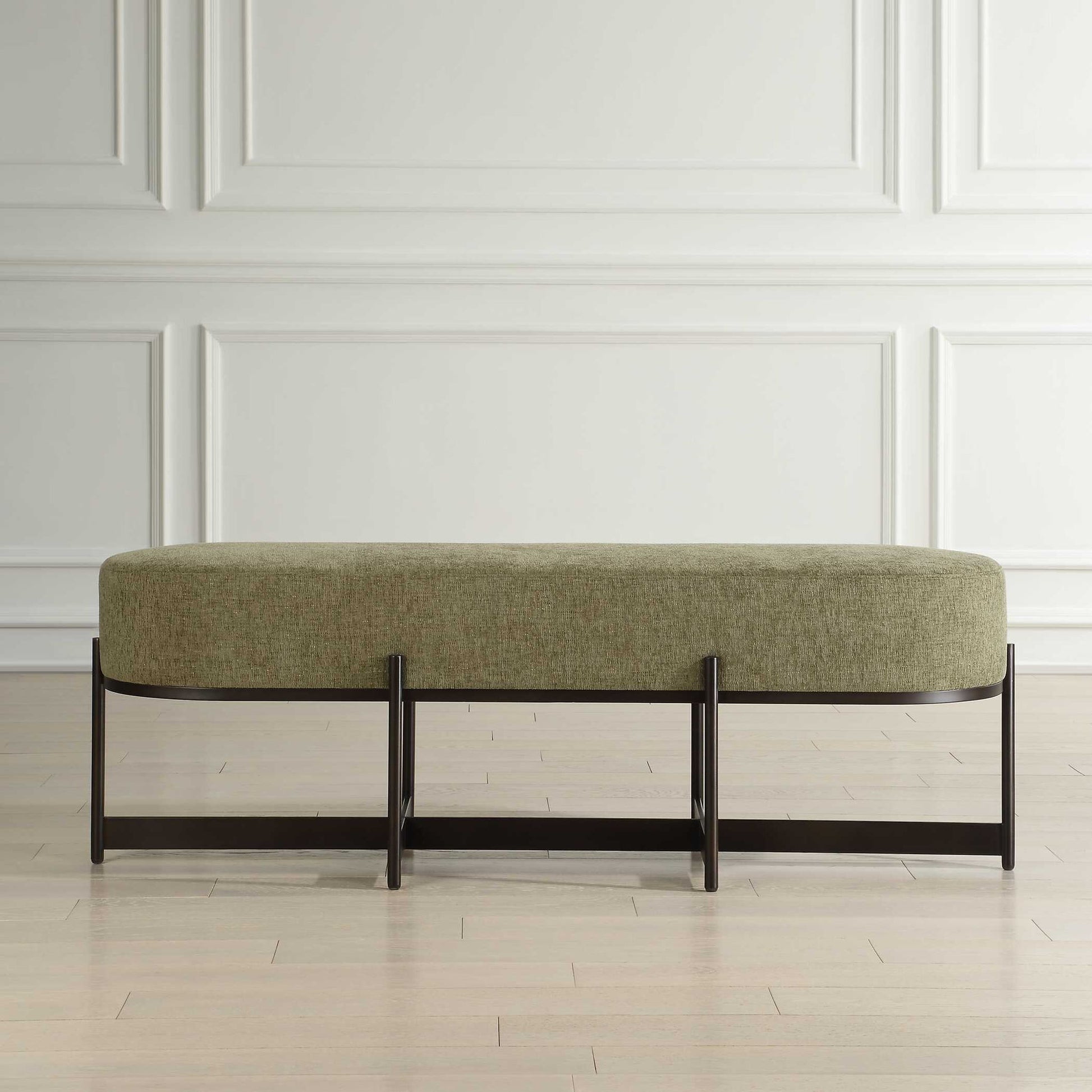 The Angular Bronze Iron Frame Of The Merino Bench Cradles The Plush Seat, Upholstered In A Finely Textured Moss Toned Polyester.