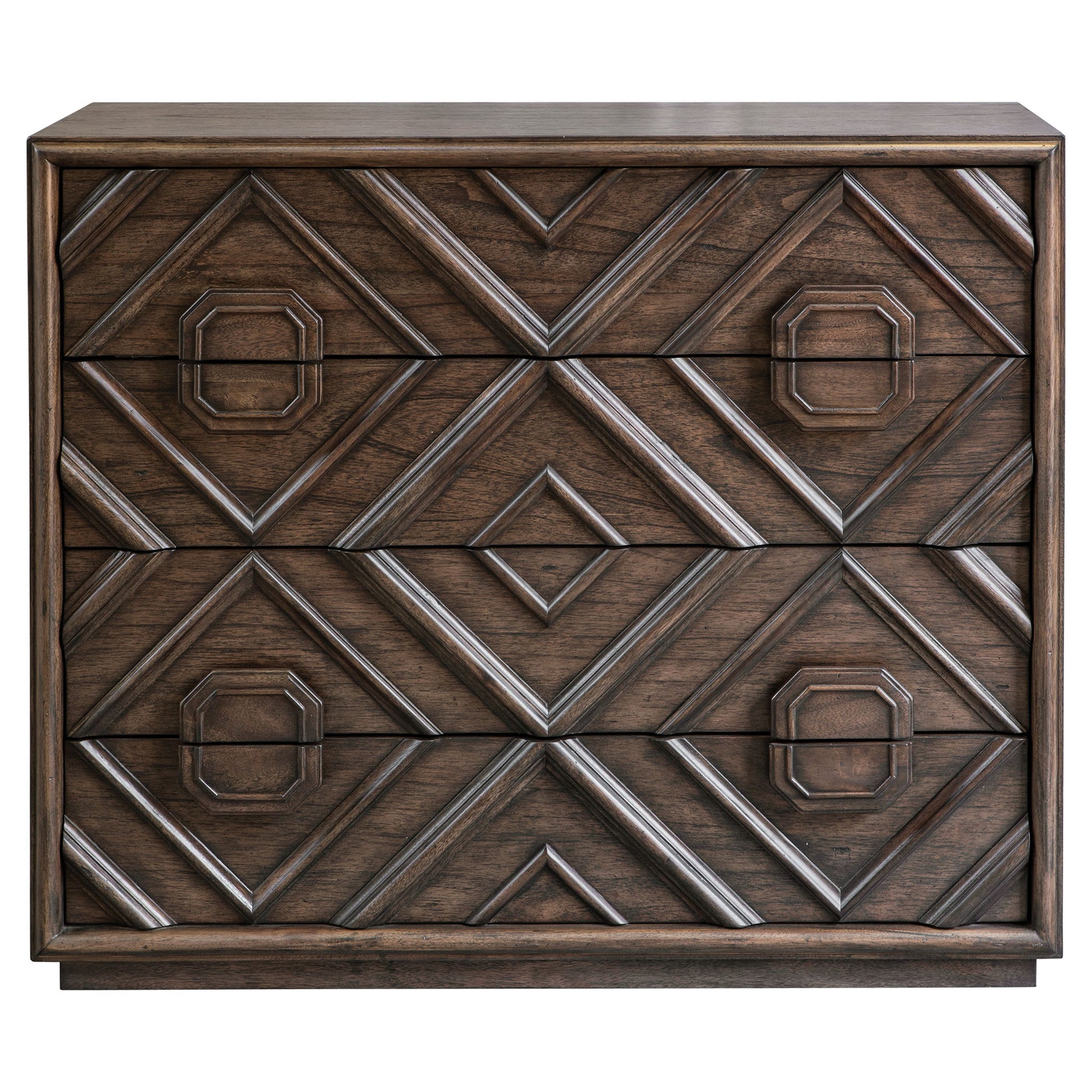 With A Transitional Deep Walnut Finish Over Mindi Veneer, Naturally Distressed And Hand Rubbed To Expose Natural Undertones, This Four Drawer Chest Features An Updated Geometric Carved Molding Front Over A Floating Plinth Base.