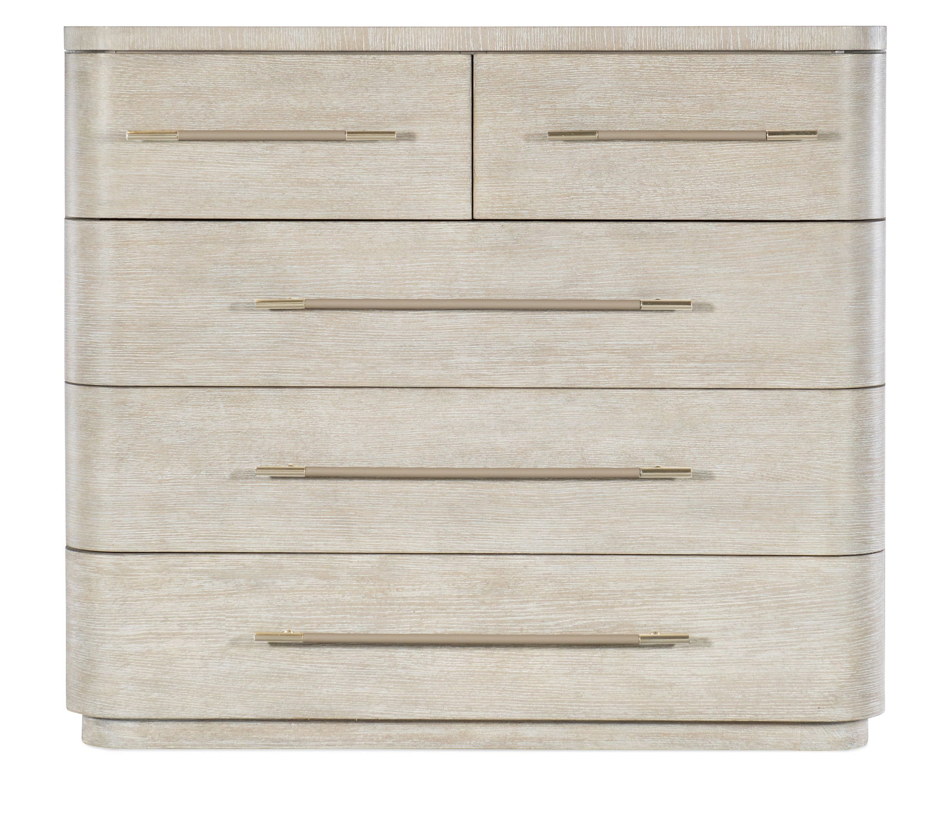 Softly sophisticated with a clean modern profile and luxe mixture of materials, the Modern Mood Bachelor’s Chest is a stunning statement piece. The case has rounded corners and a plinth base and offers five self-closing drawers. The top two drawers are felt-lined, and the bottom drawer is cedar-lined. Crafted of Oak Veneers, the nightstand is finished in the serene Diamond color and accented by metal pulls wrapped in leather.