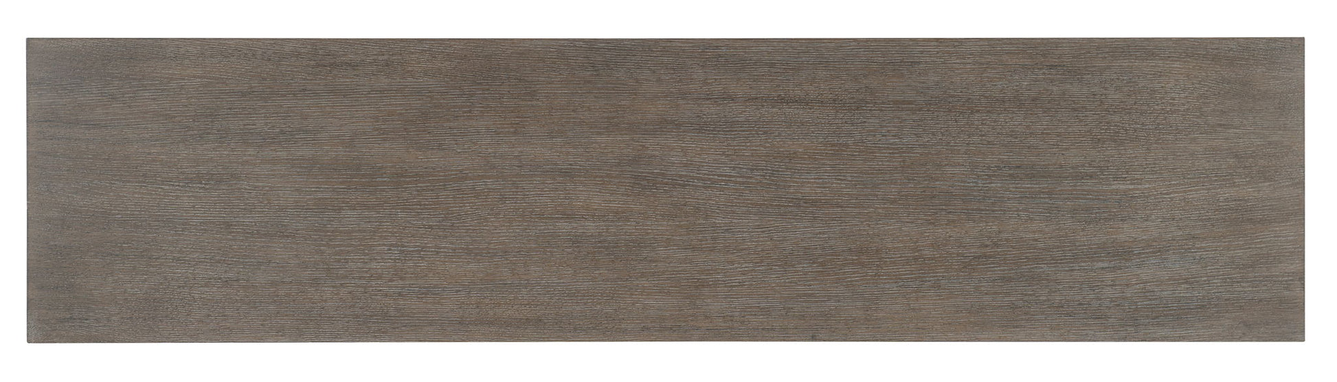 Sleek and stunning with a timeless sophistication and soft modern aesthetic, the Modern Mood Entertainment Console combines Quartered Oak Veneers with raffia-wrapped doors, warm pewter brushed metal bar pulls and leather accents. The Diamond Finish has crystal-like alabaster and pewter hues, offering a serene style. Features include four doors with soft-close hinges and magnetic catches, two adjustable wood shelves behind each pair of doors, ventilated back panels and wire management holes in the back panel and a three-plug electrical outlet behind the right-side doors.
