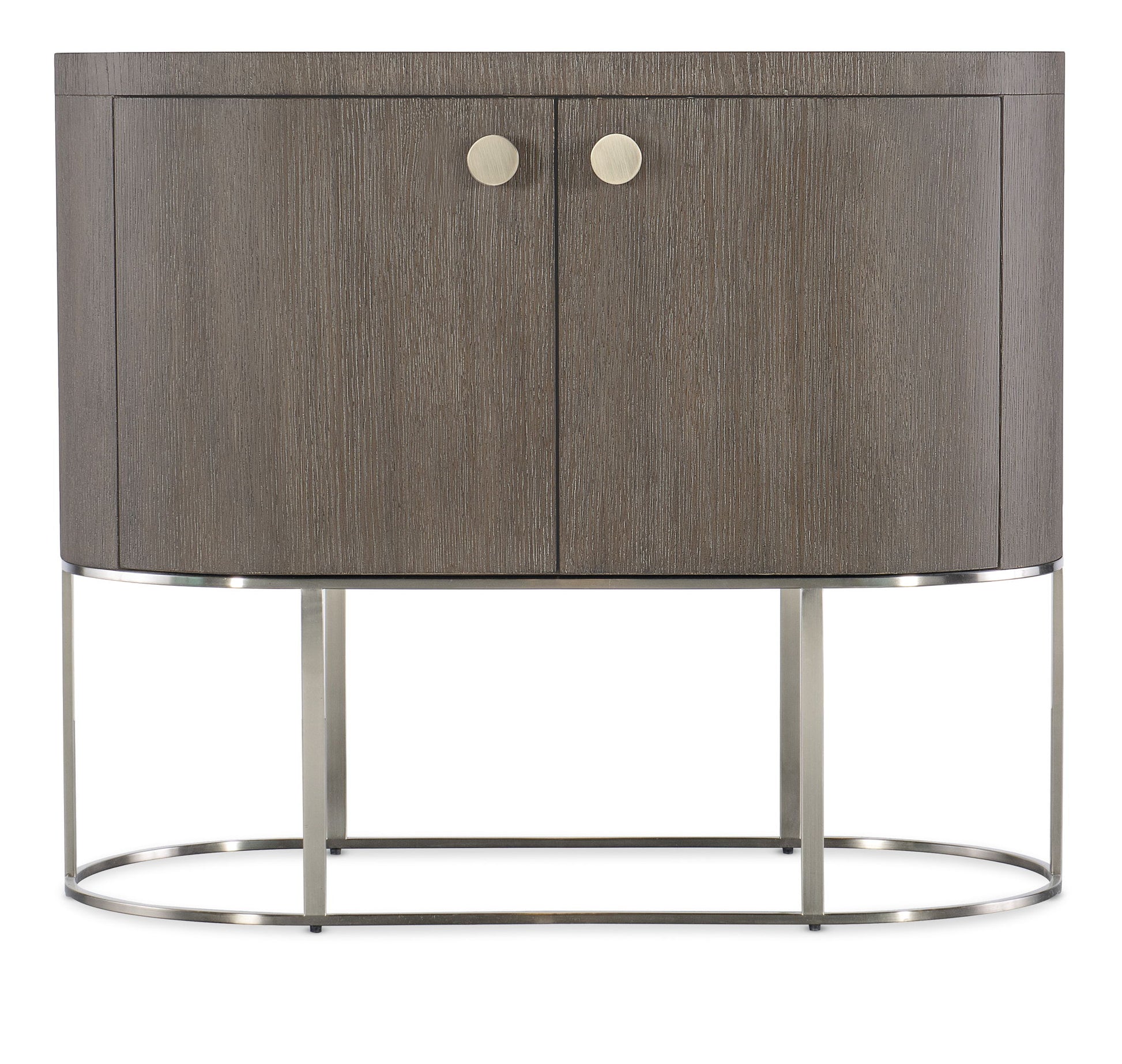 Architectural and timeless with a luxe mixture of materials, the Modern Mood Oval Nightstand is a statement piece. The shaped metal base gives the nightstand a floating appearance. Crafted with Quartered Oak Veneers, the piece is finished in a serene, crystal-like Diamond color. The two doors have soft-close hinges and magnetic door catches, and there’s one adjustable shelf behind. Finished on all sides and features wire management on the back.