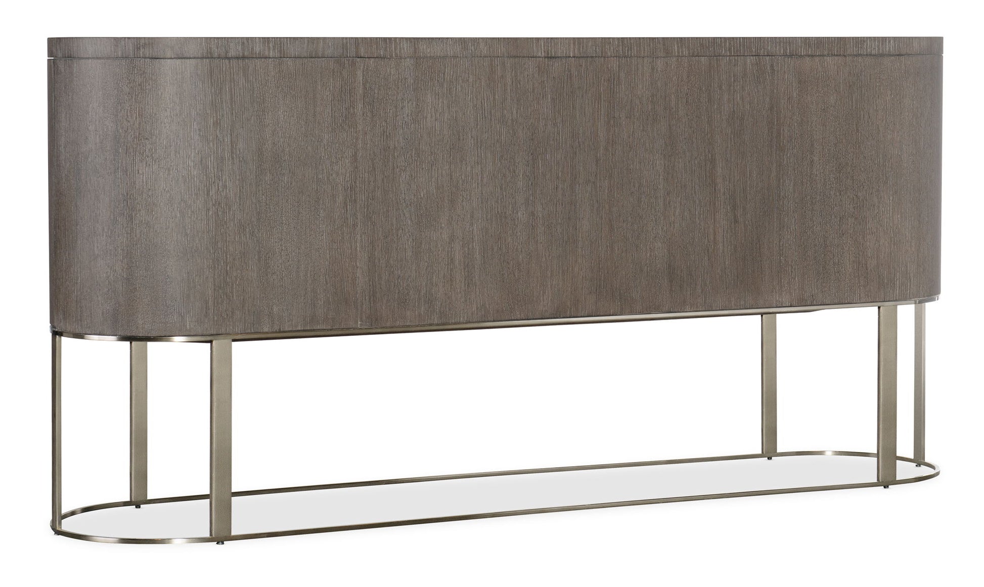 Softly sophisticated with a clean modern profile and luxe mixture of materials, the Modern Mood Server is a stunning statement piece. The case has rounded corners, is finished on all sides and has an oval metal stretcher that goes all the way around. Crafted of Quartered Oak Veneers, the server has tactile wire-brush detailing in a serene Diamond finish. The metal on the hardware and base is in a brushed warm pewter finish, and the bar pulls are wrapped in leather. The two wood doors have soft-close hinges and magnetic catches. There’s one adjustable wood shelf behind each door, and the two drawers are self-closing and feature a drop-in silver tray liner in the top drawer.