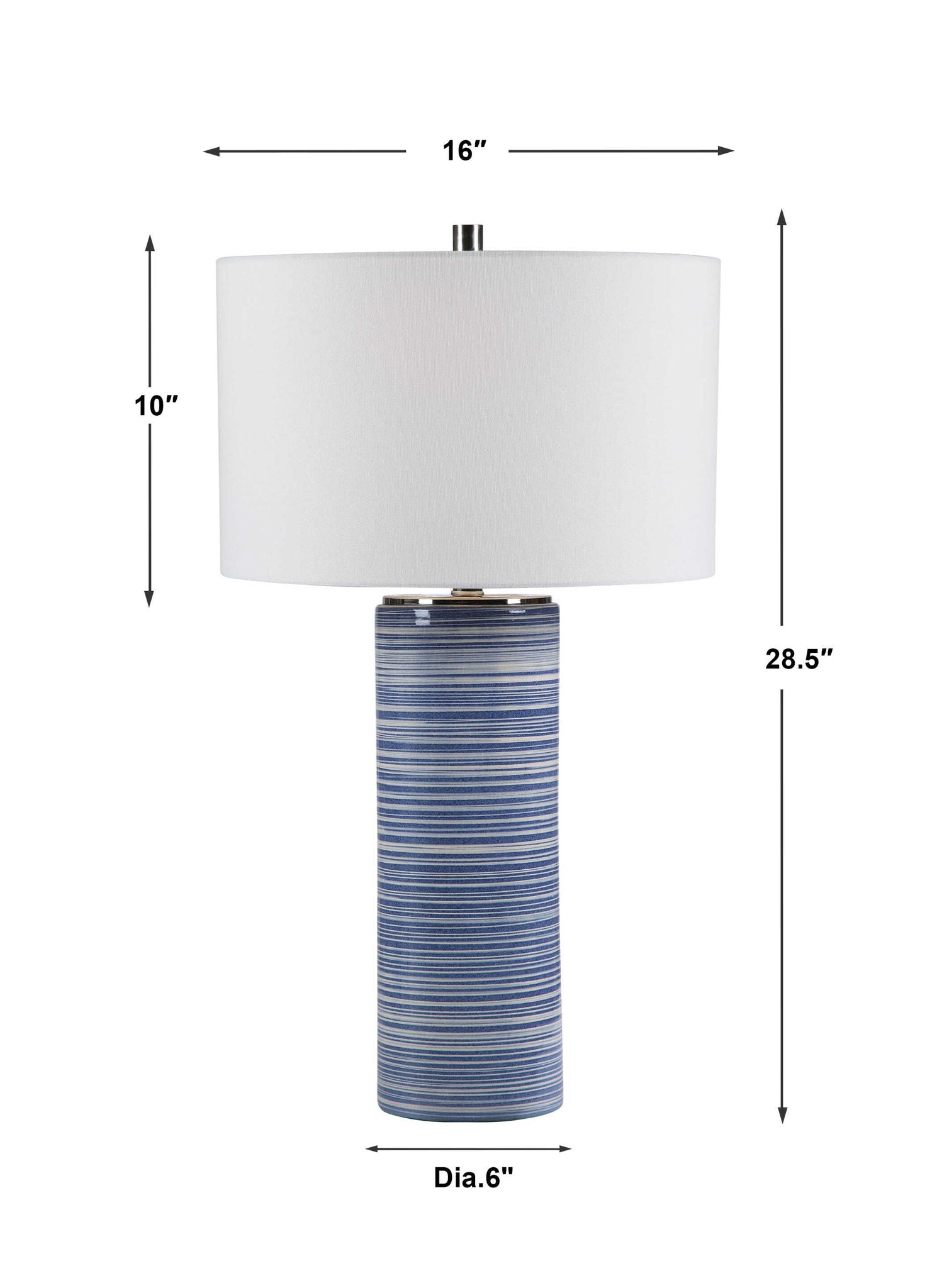 Showcasing Trendy White And Indigo Blue Hues, This Ceramic Table Lamp Has A Striped Glaze With Polished Nickel Accents. The Round Hardback Drum Shade Is A White Linen Fabric.